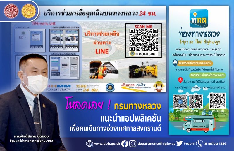 กรมทางหลวง เชิญชวนประชาชนดาวน์โหลดแอปพลิเคชันเพื่อการเดินทาง ครอบคลุมในเรื่องการเดินทางทั้ง สภาพการจราจร, สถานการณ์การจราจรแบบเรียลไทม์, ตำแหน่งตรวจจับกล้องจับความเร็ว, บริการฉุกเฉิน 24ชม., สถานีบริการน้ำมัน เเละการเดินทางท่องเที่ยวในช่วงเทศกาลสงกรานต์นี้ ตามนโยบายของนายศักดิ์สยาม ชิดชอบ รัฐมนตรีว่าการกระทรวงคมนาคม ที่ต้องการให้นำเทคโนโลยีมาใช้แบบเรียลไทม์ นำเสนอข้อมูลผ่านแอปพลิเคชั่นเพื่อให้ประชาชนใช้ตัดสินใจในการเลือกเส้นทาง ไม่เฉพาะช่วงเทศกาลเท่านั้น