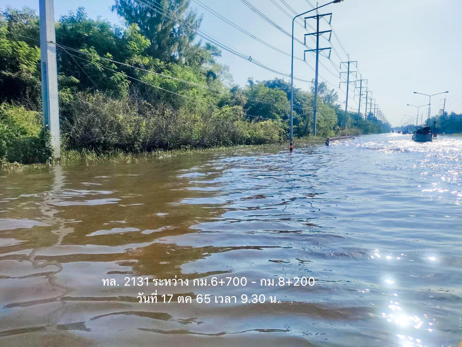 - ทางหลวงหมายเลข 3501 ตอน อ่างทอง – บางหลวงโดด ในพื้นที่ อ.ป่าโมก ช่วง กม.ที่ 9+900 – 10+400 ระดับน้ำนอกคันกั้นดิน 80 ซม. น้ำท่วมผิวจราจร 10 - 20 ซม. การจราจรไม่สามารถผ่านได้
