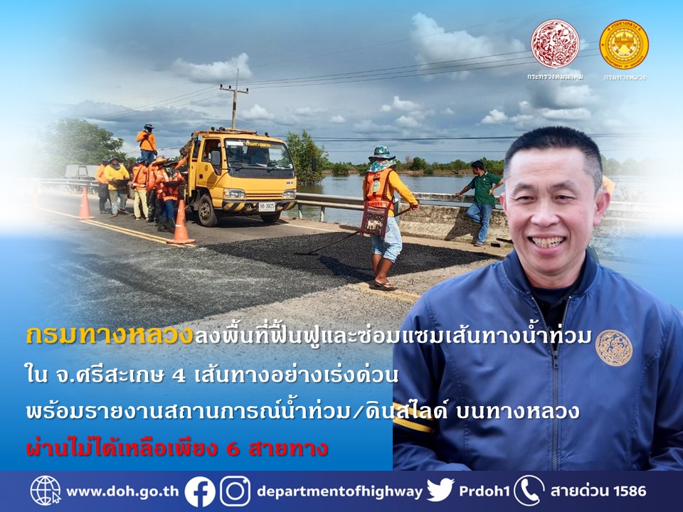 นายสราวุธ ทรงศิวิไล อธิบดีกรมทางหลวง เปิดเผยว่า จากสถานการณ์น้ำท่วมบนทางหลวงในหลายจังหวัด ส่งผลกระทบให้ประชาชนในพื้นที่และรอบๆ ได้รับความเดือดร้อน ซึ่งที่ผ่านมากรมทางหลวงได้ให้ความช่วยเหลือทั้งกรณีเร่งด่วนและต่อเนื่องตามสถานการณ์ โดยดำเนินการตามนโยบาย นายศักดิ์สยาม ชิดชอบ รัฐมนตรีว่าการกระทรวงคมนาคม ที่ให้ความสำคัญในการช่วยเหลือผู้ประสบอุทกภัย พร้อมแสดงความห่วงใยและส่งกำลังใจถึงประชาชนในพื้นที่ให้สามารถผ่านวิกฤตการณ์ดังกล่าวไปได้โดยเร็ว โดยในวันที่ 28 ตุลาคม 2565 แขวงทางหลวงศรีสะเกษที่ 1 ได้ดำเนินการฟื้นฟูและซ่อมแซมเส้นทางที่ได้รับความเสียหายจากภัยพิบัติ ทำการปะซ่อมผิวทางให้ประชาชนกลับมาสัญจรได้อย่างปกติ จำนวน 4 เส้นทาง ได้แก่