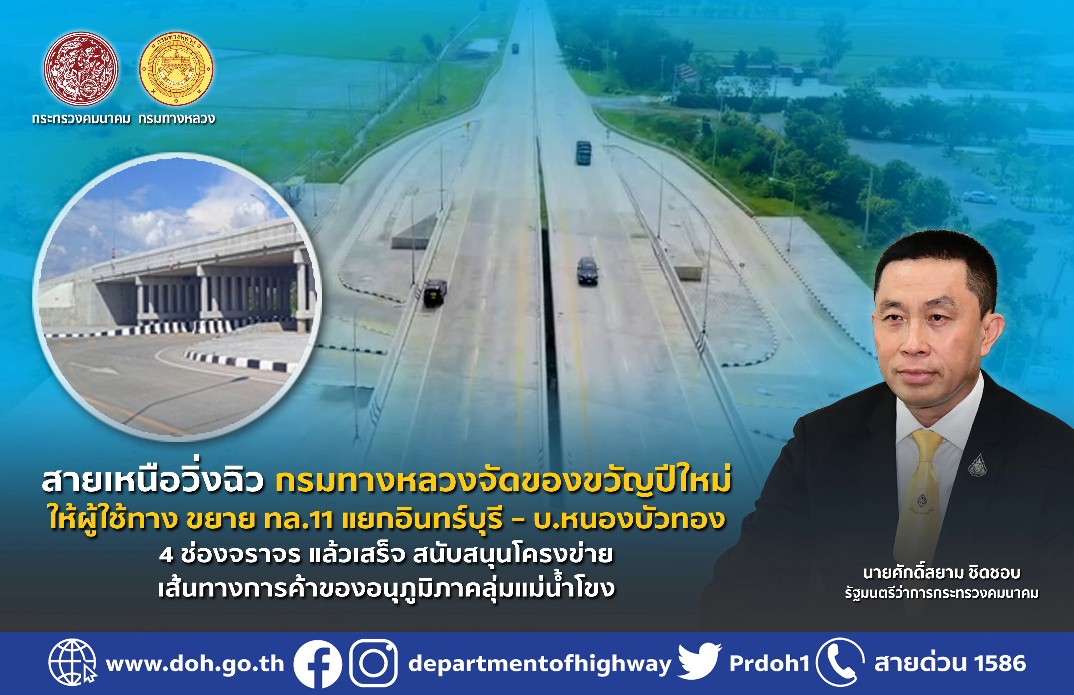 นายสราวุธ ทรงศิวิไล อธิบดีกรมทางหลวง เปิดเผยว่า ทางหลวงแผ่นดินหมายเลข 11 สายอินทร์บุรี – เชียงใหม่ เป็นทางหลวงแผ่นดินสายประธานแนวเหนือ – ใต้ เชื่อมการคมนาคมระหว่างจังหวัดในภาคกลางกับจังหวัดในภาคเหนือของประเทศไทย มีระยะทางประมาณ 545 กิโลเมตร โดยเริ่มต้นจากทางแยกต่างระดับอินทร์บุรี บนทางหลวงหมายเลข 32 ในพื้นที่อำเภออินทร์บุรี จังหวัดสิงห์บุรี ปลายทางบรรจบกับถนนสุเทพ ในอำเภอเมือง จังหวัดเชียงใหม่ ซึ่งมีอัตราการเดินทางและขนส่งเพิ่มสูงขึ้นทุกปี ดังนั้น กรมทางหลวงจึงดำเนินการก่อสร้างขยายตอน แยกอินทร์บุรี – บ.หนองบัวทอง จุดเริ่มต้นโครงการบริเวณ แยกอินทร์บุรี ต.ท่างาม อ.อินทร์บุรี จ.สิงห์บุรี ที่กม.0+000 มีจุดสิ้นสุดที่บริเวณ ต.ช่องแค อ.ตาคลี จ.นครสวรรค์ ที่ กม.28+000 ระยะทางยาวประมาณ 28 กิโลเมตร จากมาตรฐานเดิมขนาด 2 ช่องจราจร เป็นมาตรฐานทางชั้นพิเศษ 4 ช่องจราจร ผิวทางแบบคอนกรีต ช่องจราจรกว้างช่องละ 3.5 เมตร ไหล่ทางด้านนอกกว้าง 2.5 เมตร ด้านในกว้าง 1.5 เมตร รวมผิวทางกว้าง 11 เมตร แบ่งทิศทางการจราจรด้วยเกาะกลางแบบแบริเออร์คอนกรีต พร้อมติดตั้งไฟฟ้าแสงสว่างและอุปกรณ์อำนวยความปลอดภัยตลอดเส้นทาง งบประมาณ 2,202,235,089.72 บาท