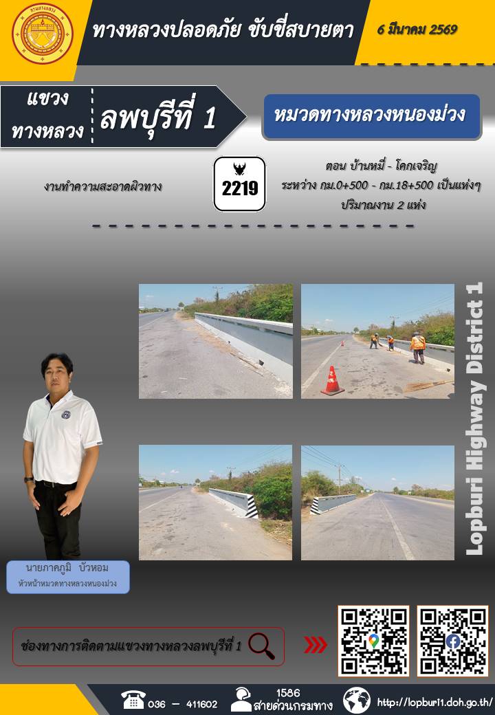 ทางหลวงปลอดภัยขับขี่สบายตา แขวงทางหลวงลพบุรีที่ 1 ประจำวันที่ 6 มีนาคม 2569