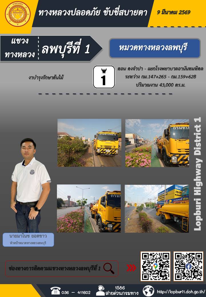 ทางหลวงปลอดภัยขับขี่สบายตา แขวงทางหลวงลพบุรีที่ 1 ประจำวันที่ 9 มีนาคม 2569