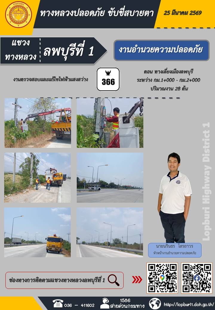 ทางหลวงปลอดภัยขับขี่สบายตา แขวงทางหลวงลพบุรีที่ 1 ประจำวันที่ 25 มีนาคม 2569