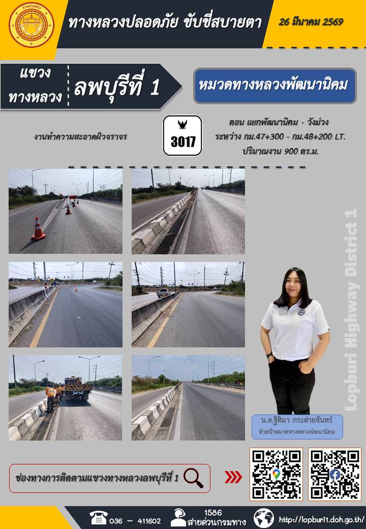 ทางหลวงปลอดภัยขับขี่สบายตา แขวงทางหลวงลพบุรีที่ 1 ประจำวันที่ 5 มีนาคม 2569