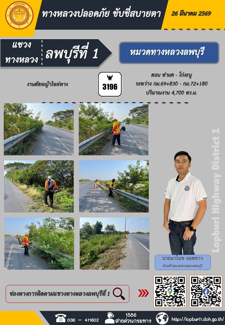 ทางหลวงปลอดภัยขับขี่สบายตา แขวงทางหลวงลพบุรีที่ 1 ประจำวันที่ 26 มีนาคม 2569