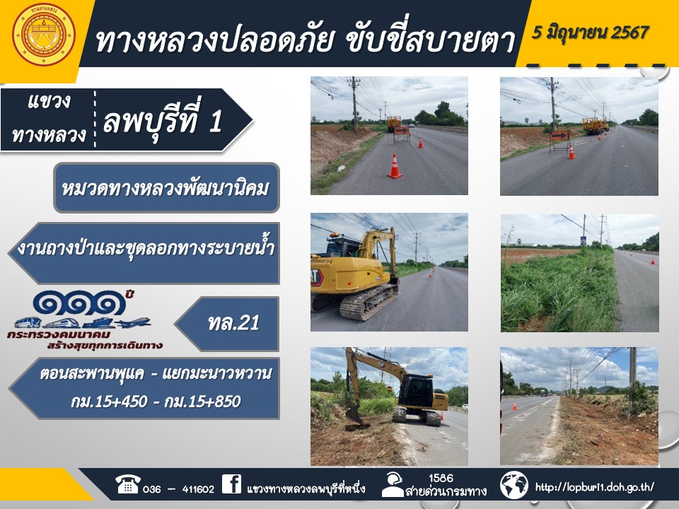 ทางหลวงปลอดภัยขับขี่สบายตา แขวงทางหลวงลพบุรีที่ 1 ประจำวันที่ 5 มิถุนายน 2567