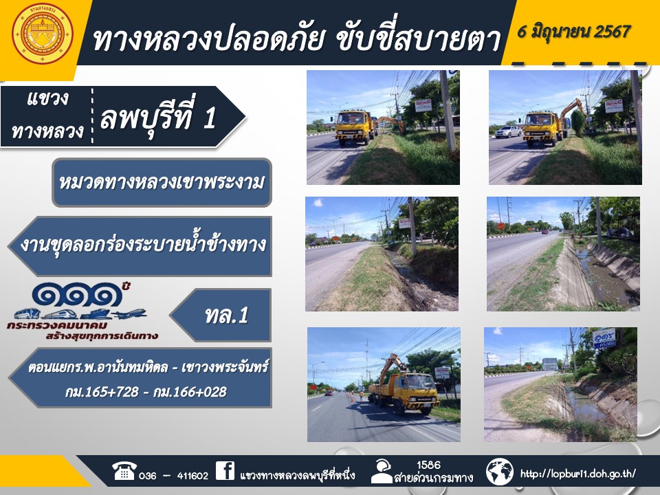 ทางหลวงปลอดภัยขับขี่สบายตา แขวงทางหลวงลพบุรีที่ 1 ประจำวันที่ 6 มิถุนายน 2567