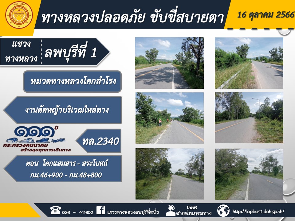 ทางหลวงปลอดภัยขับขี่สบายตา แขวงทางหลวงลพบุรีที่ 1 ประจำวันที่ 16 ตุลาคม 2566
