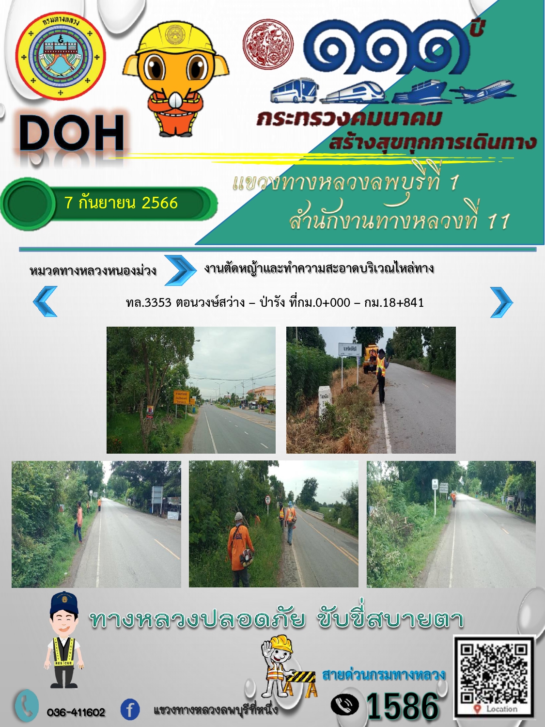 ทางหลวงปลอดภัยขับขี่สบายตา แขวงทางหลวงลพบุรีที่ 1 ประจำวันที่ 18 กันยายน 2566