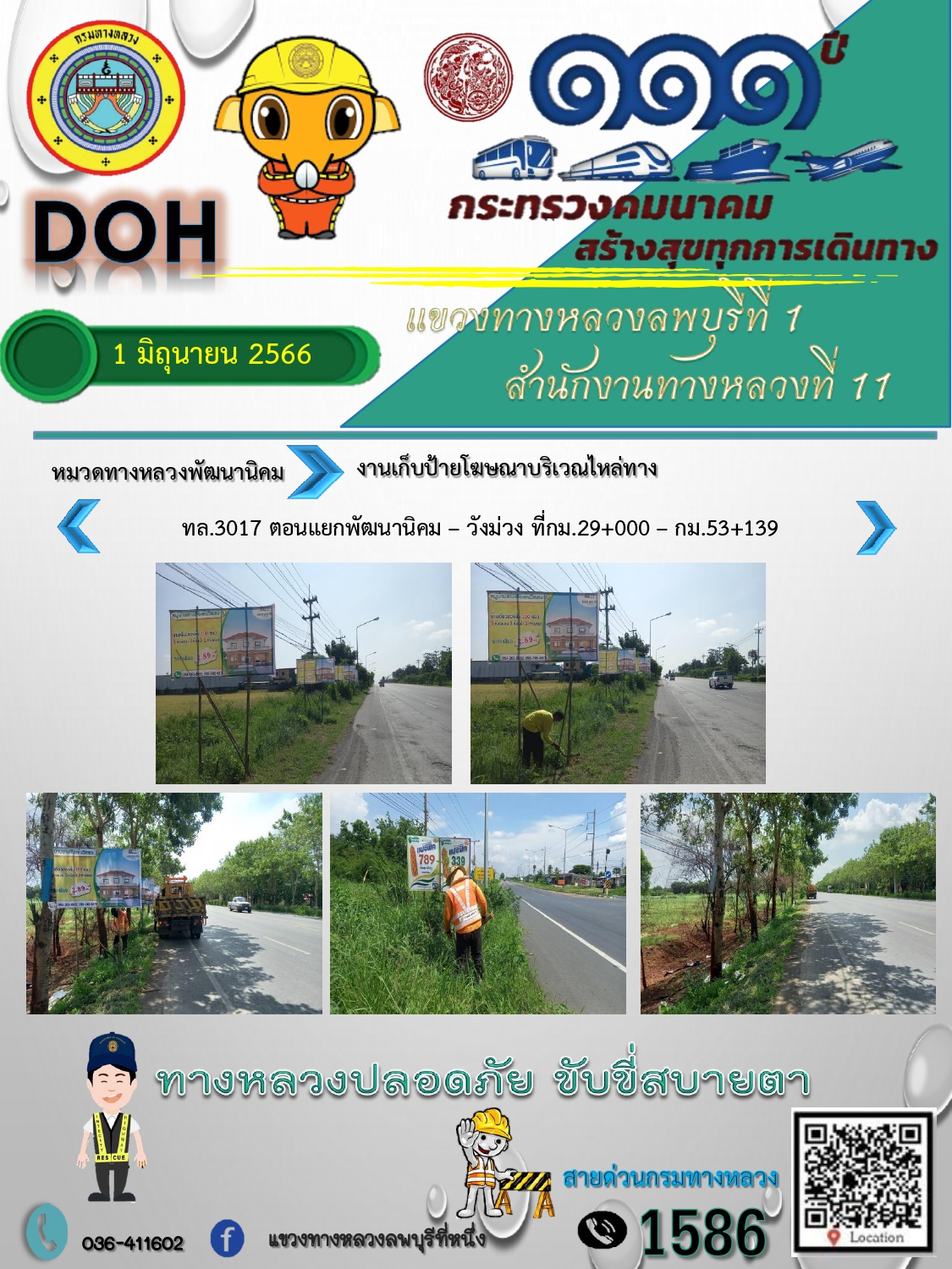 ทางหลวงปลอดภัยขับขี่สบายตา แขวงทางหลวงลพบุรีที่ 1 ประจำวันที่ 1 มิถุนายน 2566