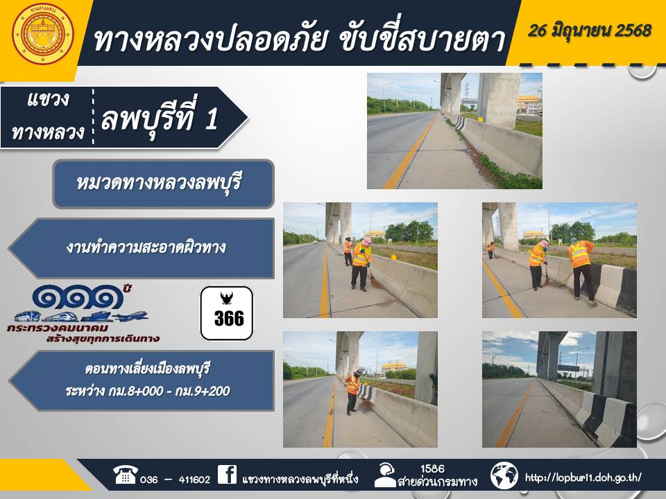 ทางหลวงปลอดภัยขับขี่สบายตา แขวงทางหลวงลพบุรีที่ 1 ประจำวันที่ 26 มิถุนายน 2568