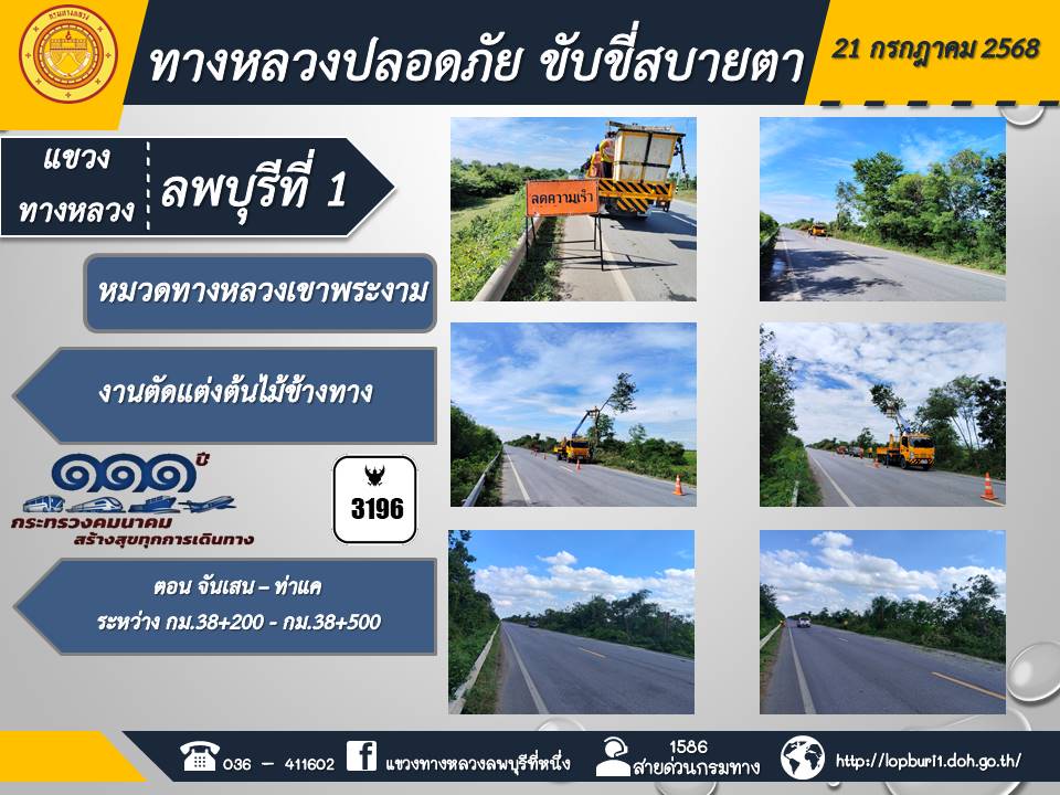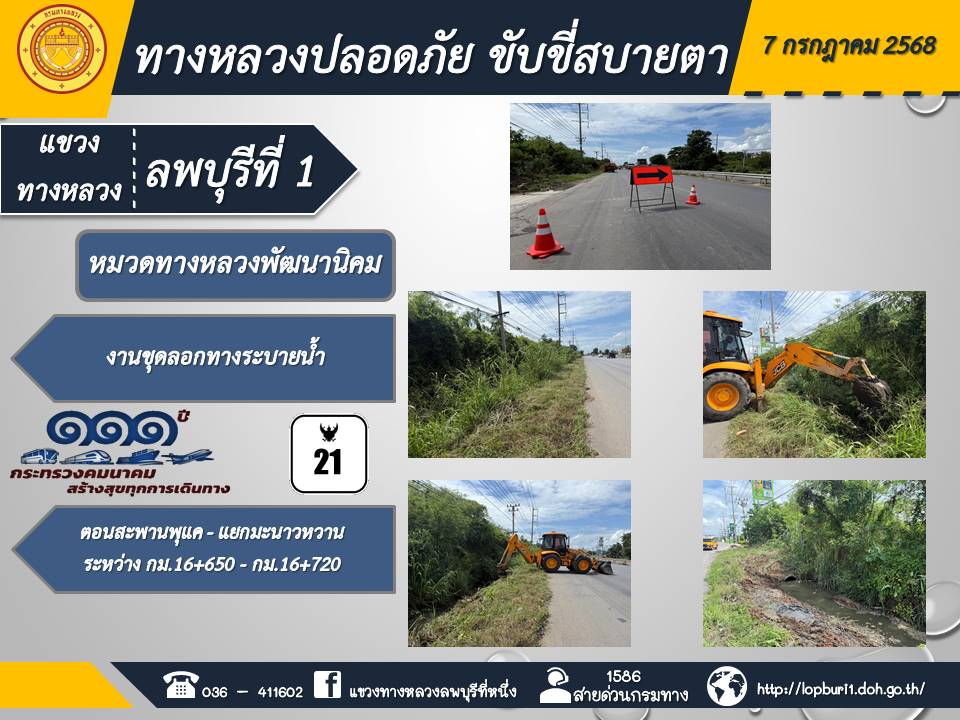 ทางหลวงปลอดภัยขับขี่สบายตา แขวงทางหลวงลพบุรีที่ 1 ประจำวันที่ 21 กรกฎาคม 2568