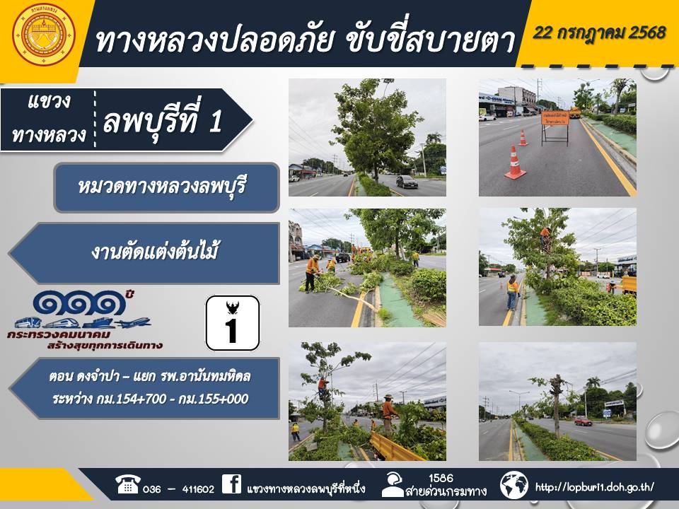 ทางหลวงปลอดภัยขับขี่สบายตา แขวงทางหลวงลพบุรีที่ 1 ประจำวันที่ 22 กรกฎาคม 2568