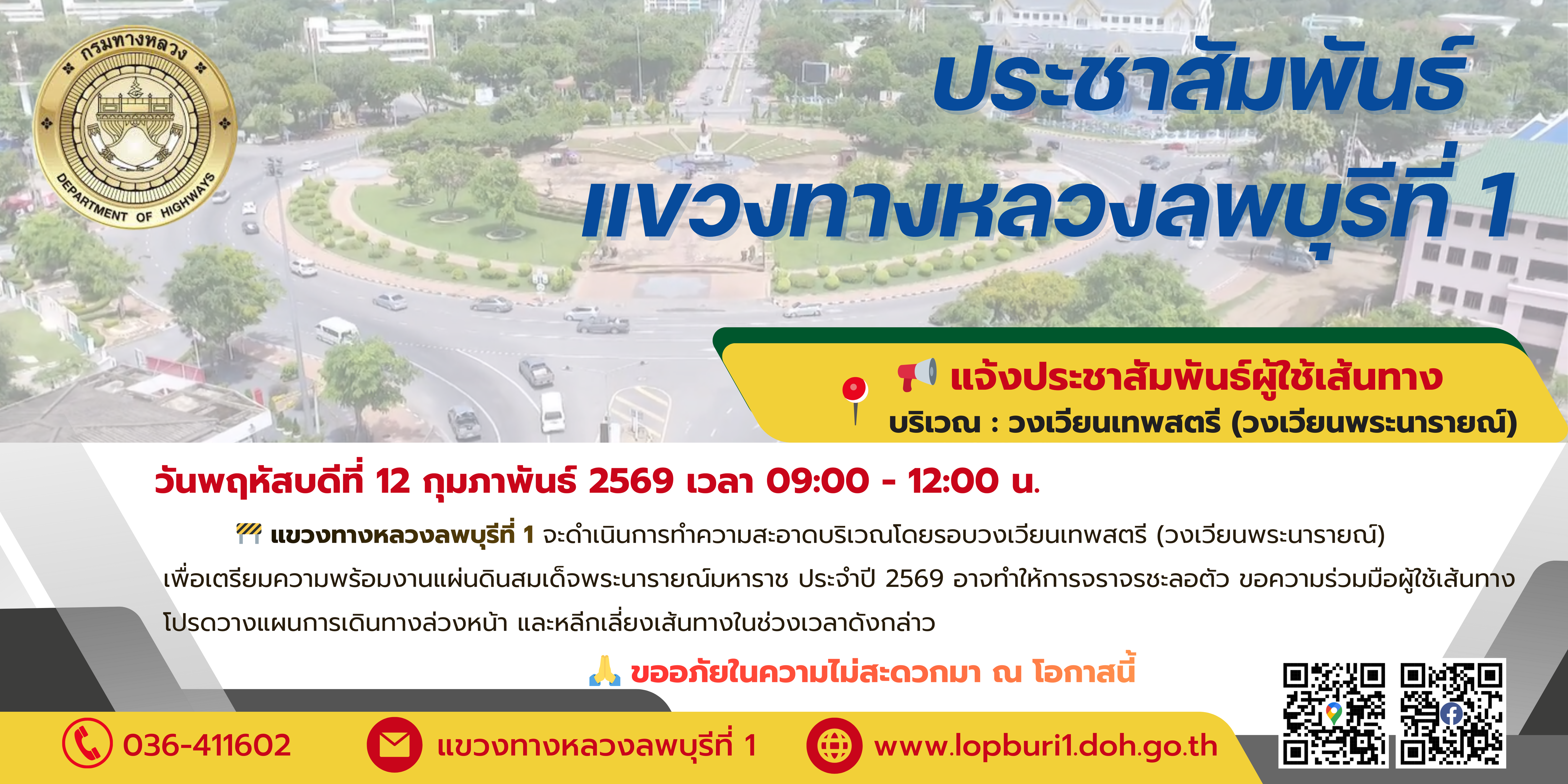 แขวงทางหลวงลพบุรีที่ 1 จะดำเนินการทำความสะอาดบริเวณโดยรอบวงเวียนเทพสตรี (วงเวียนพระนารายณ์) เพื่อเตรียมความพร้อมงานแผ่นดินสมเด็จพระนารายณ์มหาราช ประจำปี 2569 อาจทำให้การจราจรชะลอตัว ขอความร่วมมือผู้ใช้เส้นทางโปรดวางแผนการเดินทางล่วงหน้า และหลีกเลี่ยงเส้นทางในช่วงเวลาดังกล่าว ??? ตั้งแต่วันที่ วันพฤหัสบดีที่ 12 กุมภาพันธ์ 2569 เวลา 09:00 - 12:00 น.