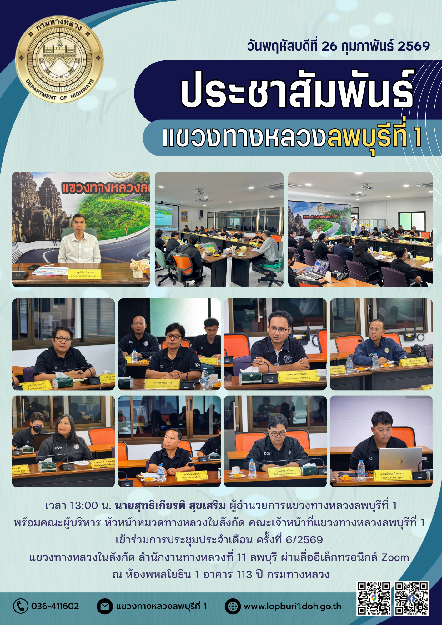 ายสุทธิเกียรติ สุขเสริม ผู้อำนวยการแขวงทางหลวงลพบุรีที่ 1 พร้อมคณะผู้บริหาร หัวหน้าหมวดทางหลวงในสังกัด คณะเจ้าหน้าที่แขวงทางหลวงลพบุรีที่ 1 เข้าร่วมการประชุมประจำเดือน ครั้งที่ 6/2569