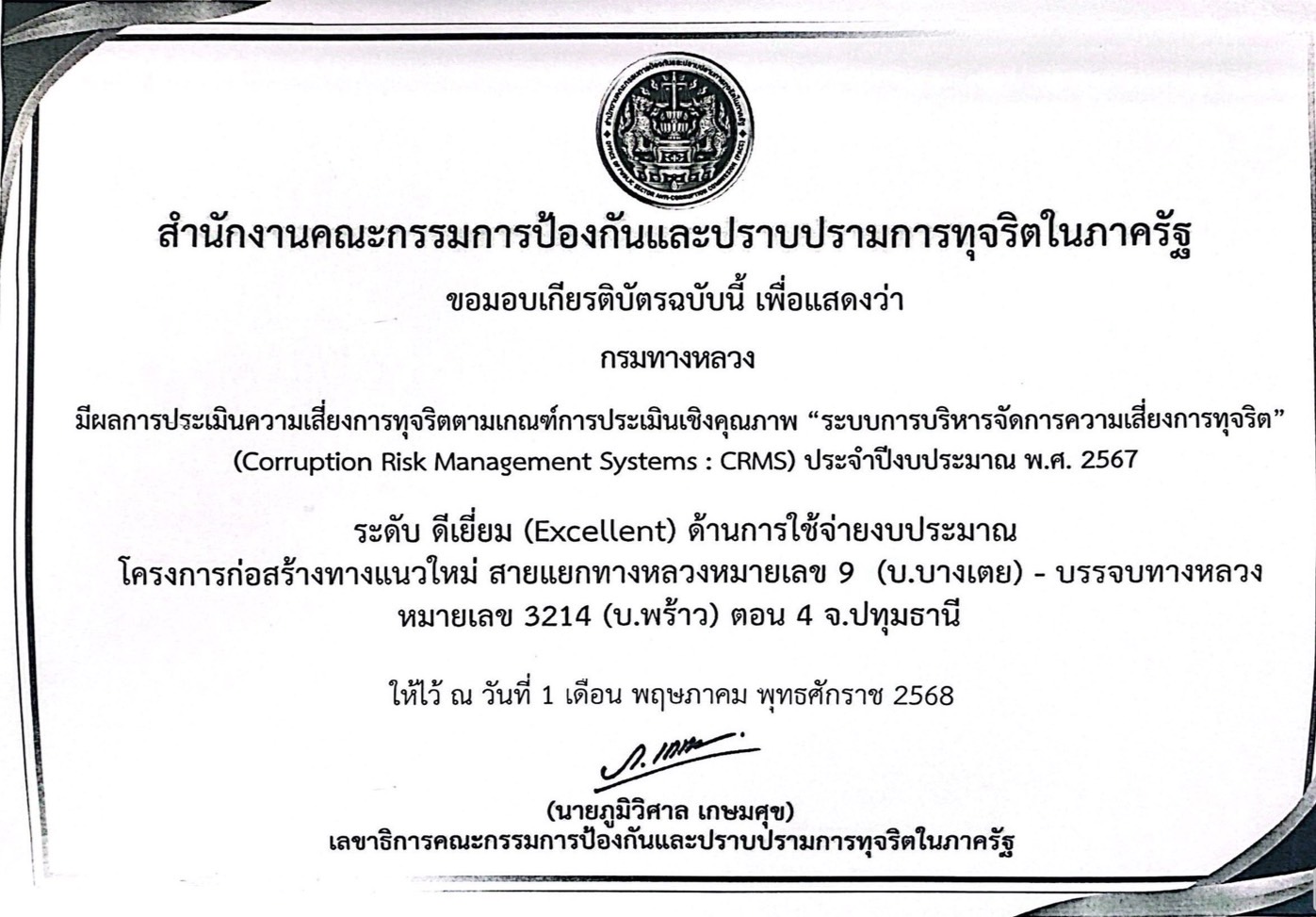 มอบเกียรติบัตรแก่หน่วยงานที่มีผลการประเมินความเสี่ยงการทุจริตในระดับดีเยี่ยม (Excellent) ประจำปีงบประมาณ พ.ศ. 2567