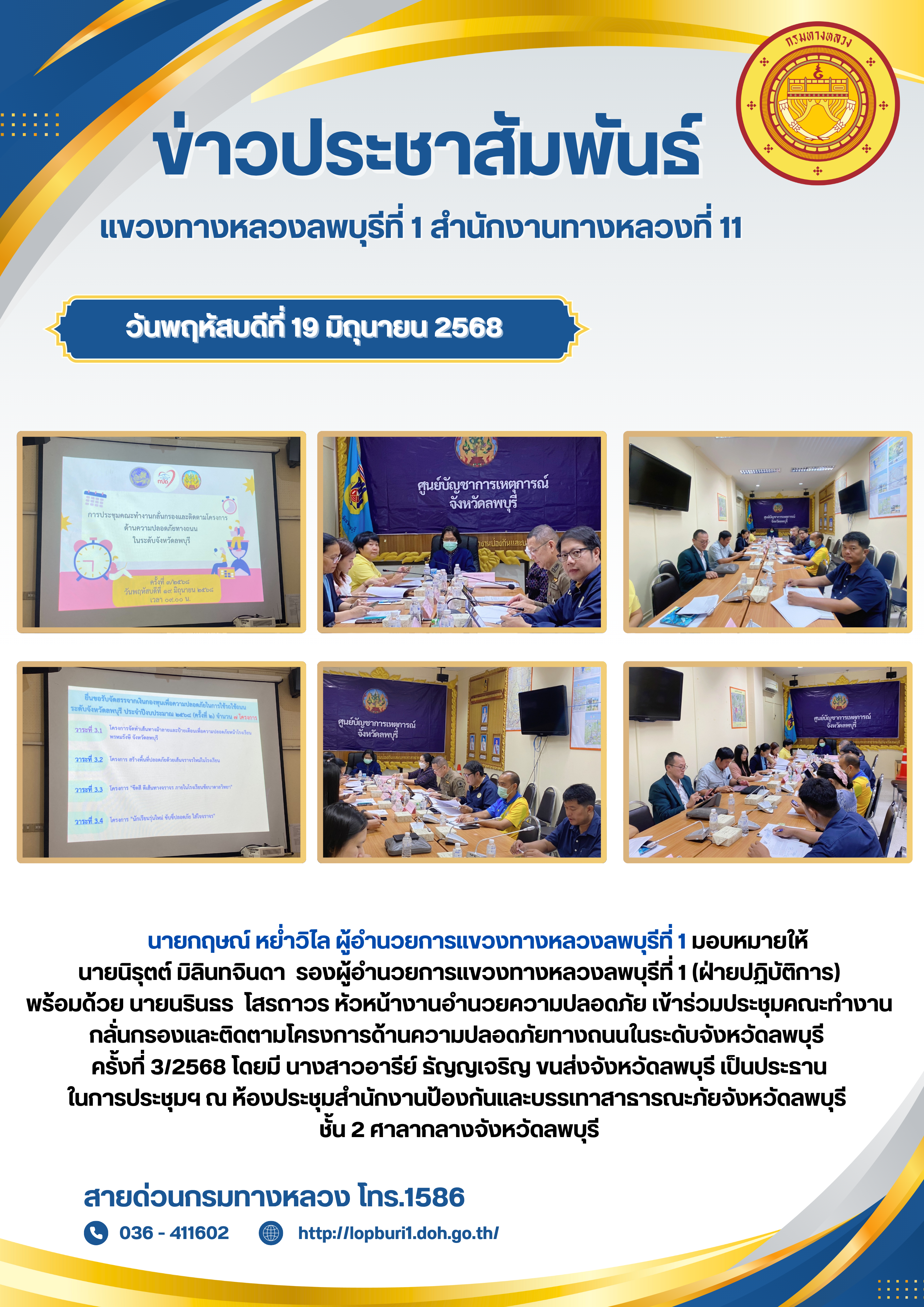 เข้าร่วมประชุมคณะทำงานกลั่นกรองและติดตามโครงการด้านความปลอดภัยทางถนนในระดับจังหวัดลพบุรี ครั้งที่ 3/2568
