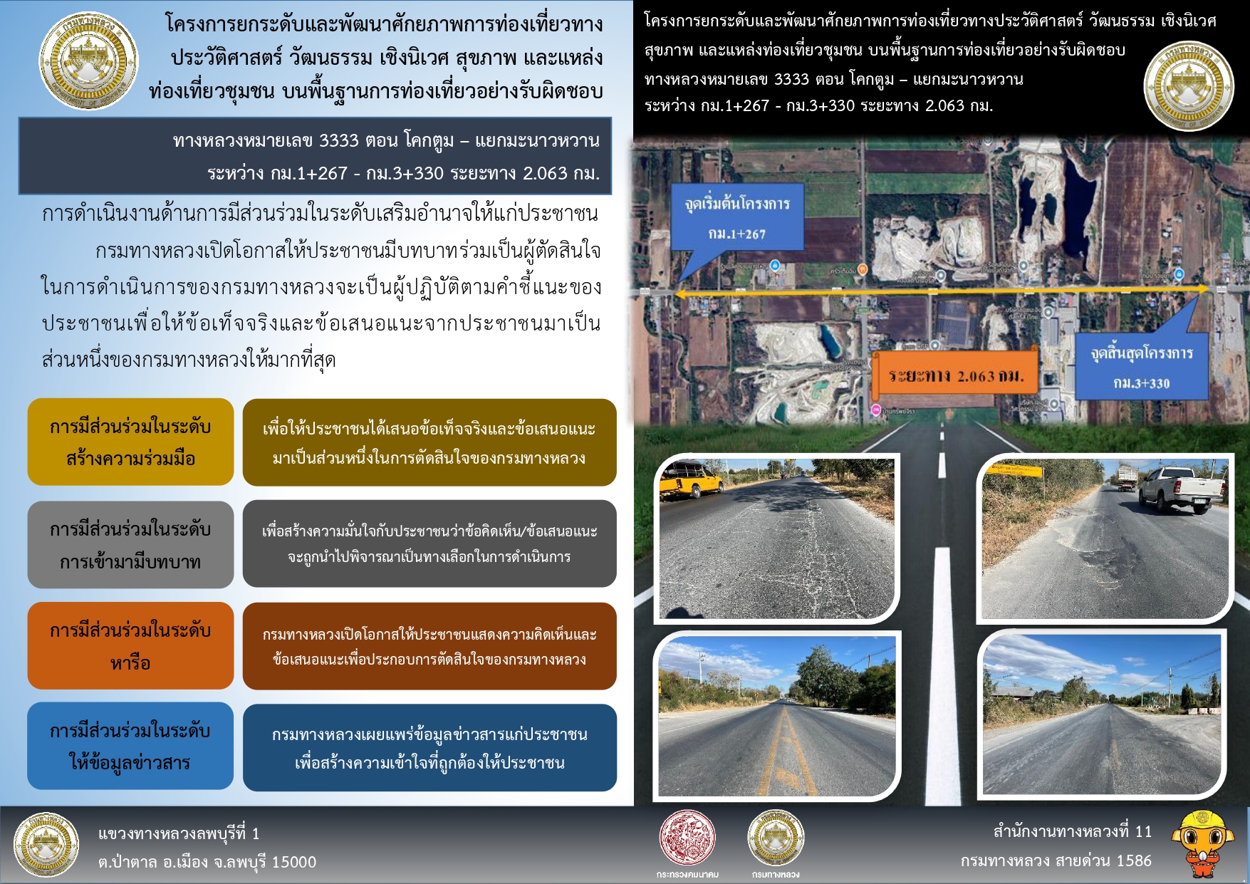 การจัดประชุมการมีส่วนร่วมของประชาชน โครงการยกระดับและพัฒนาศักยภาพการท่องเที่ยวทางประวัติศาสตร์ วัฒนธรรม เชิงนิเวศ สุขภาพ และแหล่งท่องเที่ยวชุมชน บนพื้นฐานการท่องเที่ยวอย่างรับผิดชอบ ทางหลวงหมายเลข 3333 ตอนโคกตูม – แยกมะนาวหวาน ระหว่าง กม.1+267 - กม.3+330 ปริมาณงาน 1 แห่ง