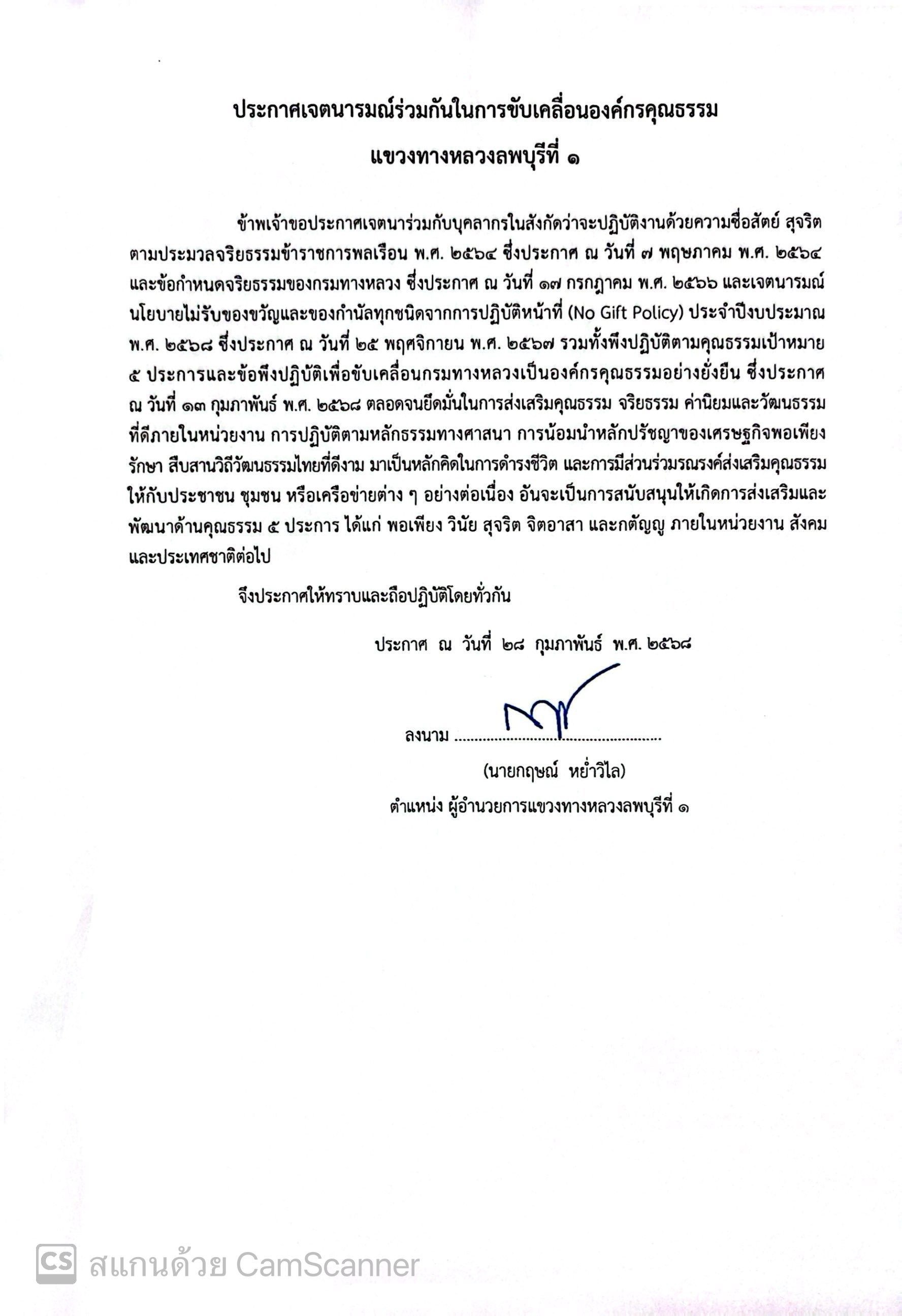 ประกาศเจตนารณ์ร่วมกัยในการขับเคลื่อนองค์กรคุณธรรม แขวงทางหลวงลพบุรีที่ 1
