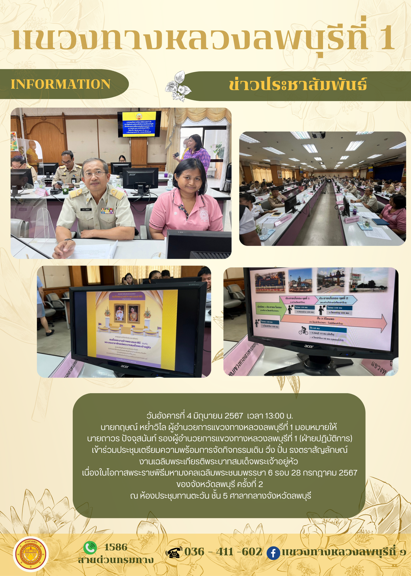 เข้าร่วมประชุมเตรียมความพร้อมการจัดกิจกรรมเดิน วิ่ง ปั่น ธงตราสัญลักษณ์ งานเฉลิมพระเกียรติพระบาทสมเด็จพระเจ้าอยู่หัว เนื่องในโอกาสพระราชพิธีมหามงคลเฉลิมพระชนมพรรษา 6 รอบ 28 กรกฎาคม 2567 ของจังหวัดลพบุรี ครั้งที่ 2