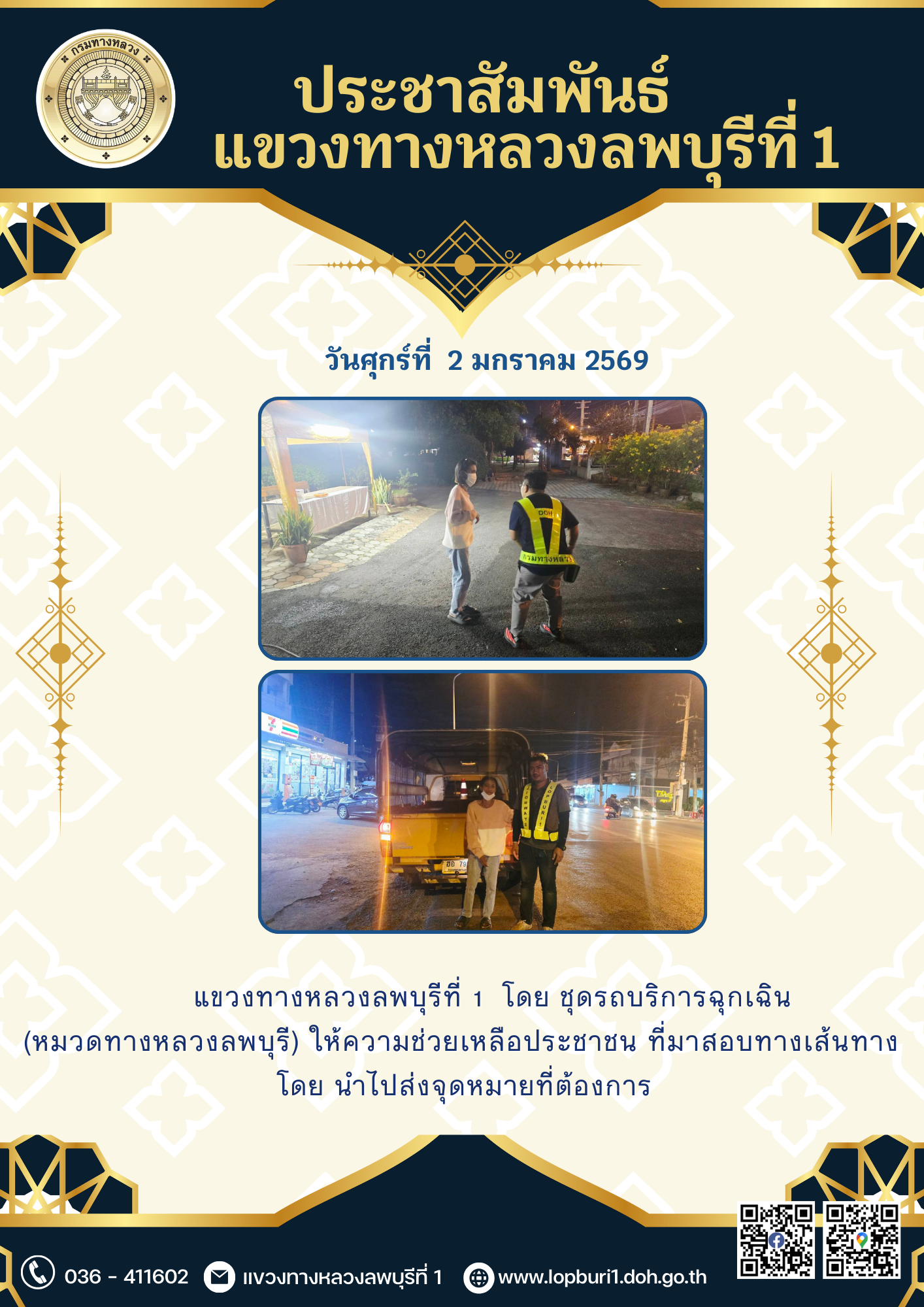 แขวงทางหลวงลพบุรีที่ 1 โดย ชุดรถบริการฉุกเฉิน (หมวดทางหลวงลพบุรี) ให้ความช่วยเหลือประชาชน ที่มาสอบถามเส้นทาง โดย นำไปส่งจุดหมายที่ต้องการ