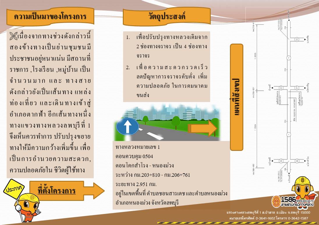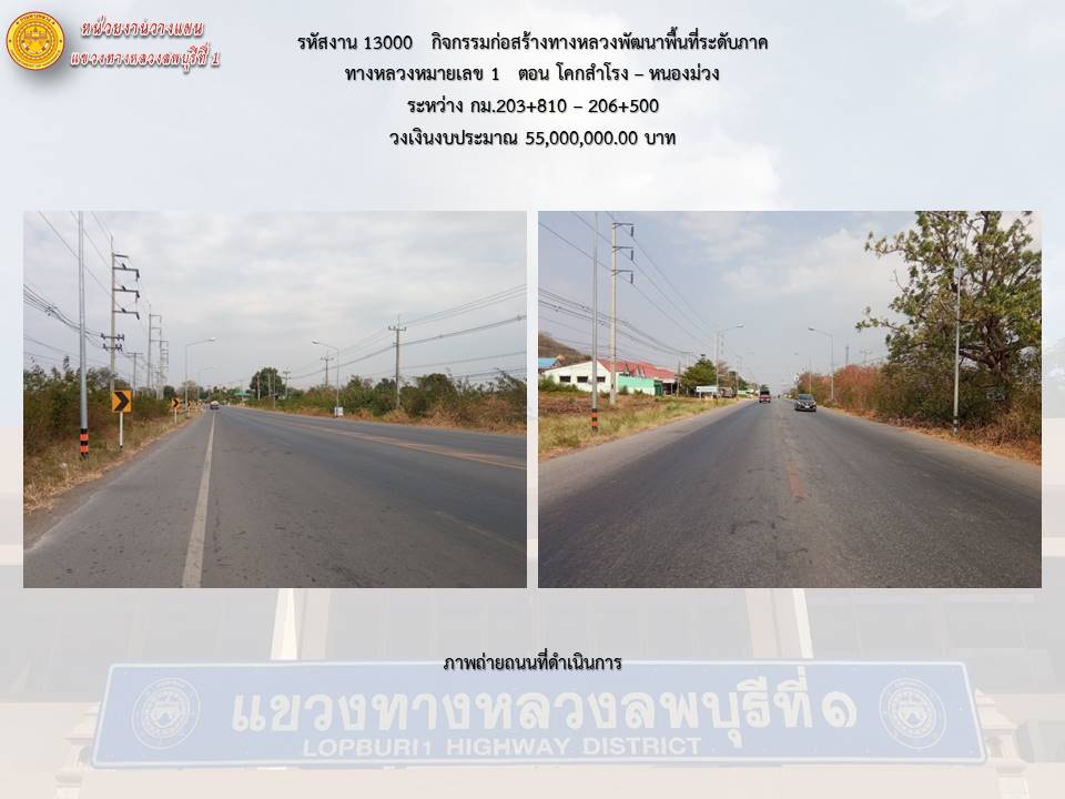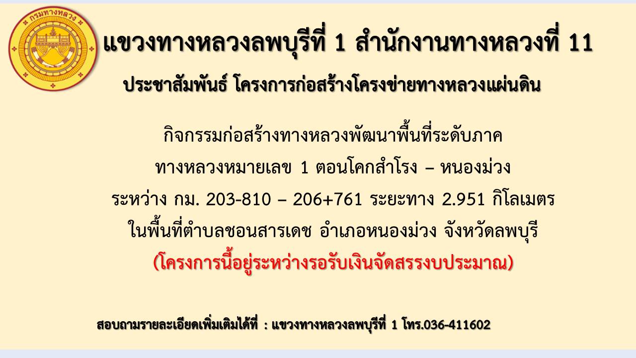 ด้วยกรมทางหลวงโดย แขวงทางหลวงลพบุรีที่ 1 มีโครงการที่จะดำเนินการก่อสร้างในปีงบประมาณ 2565 โครงการก่อสร้างโครงข่ายทางหลวงแผ่นดิน กิจกรรมก่อสร้างทางหลวงพัฒนาพื้นที่ระดับภาค ทางหลวงหมายเลข 1 ตอนโคกสำโรง – หนองม่วง ระหว่าง กม.203+810 - 206+761 ระยะทาง 2.951 กิโลเมตร วงเงินงบประมาณ 55,000,000.00 บาท