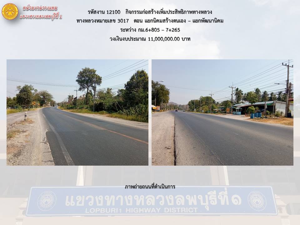 ด้วยกรมทางหลวงโดย แขวงทางหลวงลพบุรีที่ 1 มีโครงการที่จะดำเนินการก่อสร้างในปีงบประมาณ 2565 โครงการก่อสร้างโครงข่ายทางหลวงแผ่นดิน กิจกรรมก่อสร้างเพิ่มประสิทธิภาพทางหลวง ทางหลวงหมายเลข 3017 ตอน แยกนิคมสร้างตนเอง - แยกพัฒนานิคม ระหว่าง กม.6+805 - 7+265 ระยะทาง 0+460 กิโลเมตร วงเงินงบประมาณ 11,000,000.00 บาท