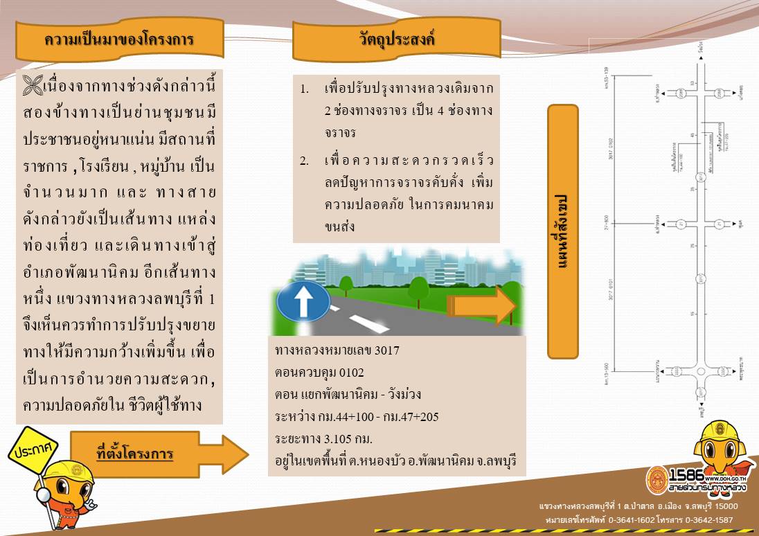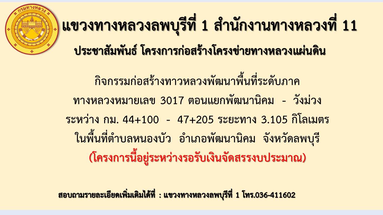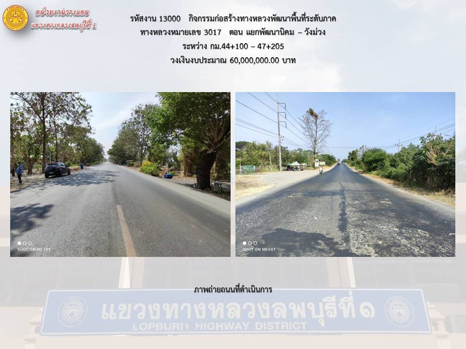 ด้วยกรมทางหลวงโดย แขวงทางหลวงลพบุรีที่ 1 มีโครงการที่จะดำเนินการก่อสร้างในปีงบประมาณ 2565 โครงการก่อสร้างโครงข่ายทางหลวงแผ่นดิน กิจกรรมก่อสร้างทาวหลวงพัฒนาพื้นที่ระดับภาค ทางหลวงหมายเลข 3017 ตอนแยกพัฒนานิคม - วังม่วง ระหว่าง กม.44+100 - 47+205 ระยะทาง 3.105 กิโลเมตร วงเงินงบประมาณ 60,000,000.00 บาท