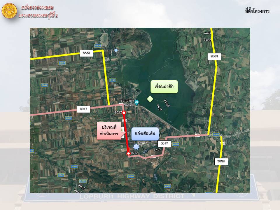ทางหลวงหมายเลข 3017 ตอนแยกพัฒนานิคม - วังม่วง ระหว่าง กม.44+100 - 47+205 ระยะทาง 3.105 กิโลเมตร ในพื้นที่ตำบลหนองบัว อำเภอพัฒนานิคม จังหวัดลพบุรี
