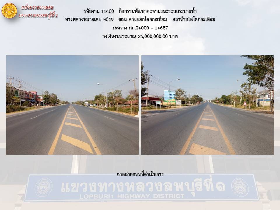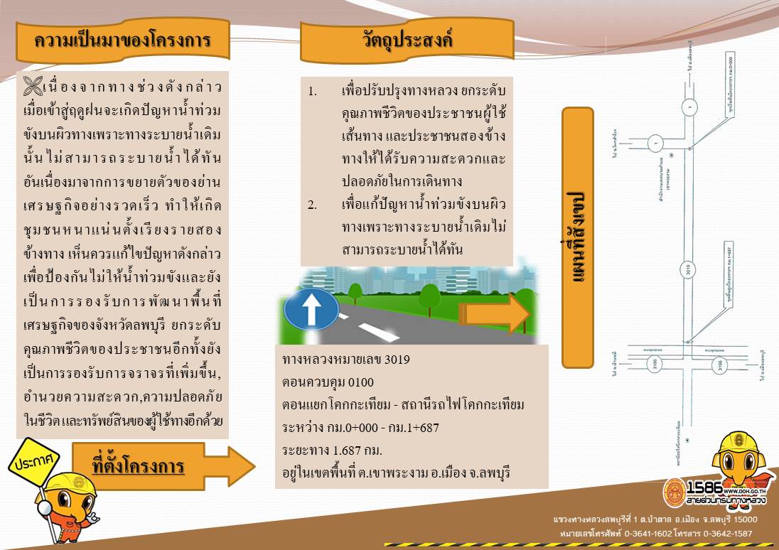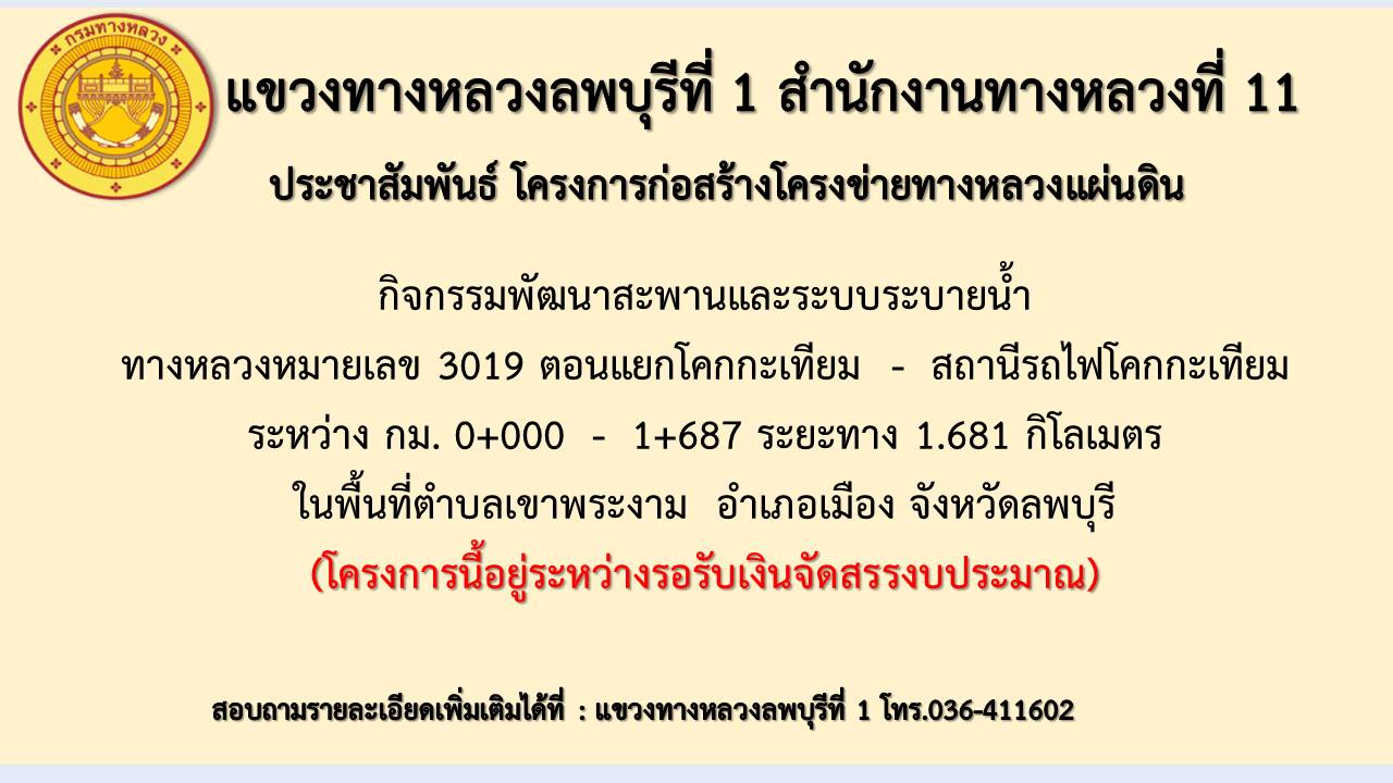 ทางหลวงหมายเลข 3019 ตอนสามแยกโคกกะเทียม – สถานีรถไฟโคกกะเทียม ระหว่าง กม.0+000 - 1+687 ระยะทาง 1.687 กิโลเมตร ในพื้นที่ตำบลเขาพระงาม อำเภอเมือง จังหวัดลพบุรี