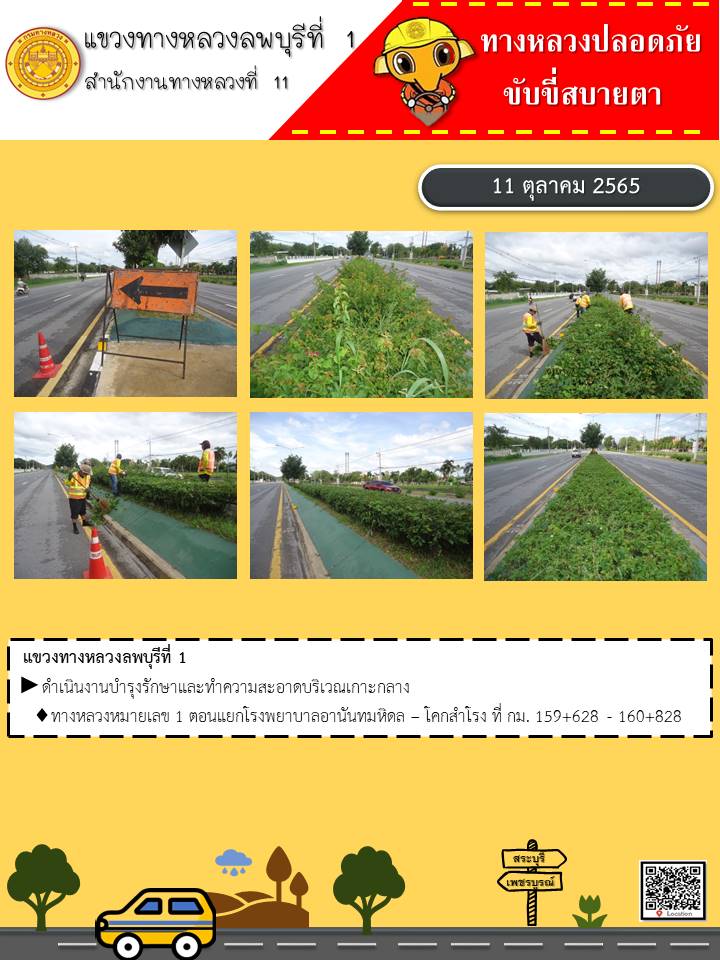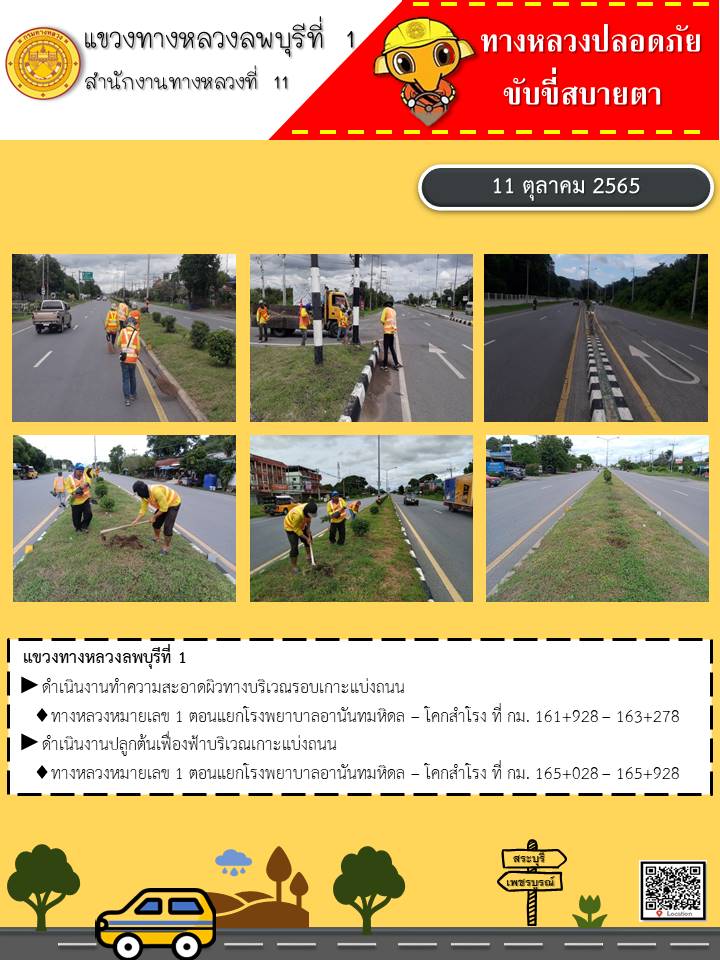 ทางหลวงปลอดภัยขับขี่สบายตา แขวงทางหลวงลพบุรีที่ 1 ประจำวันที่ 11 ตุลาคม 2565