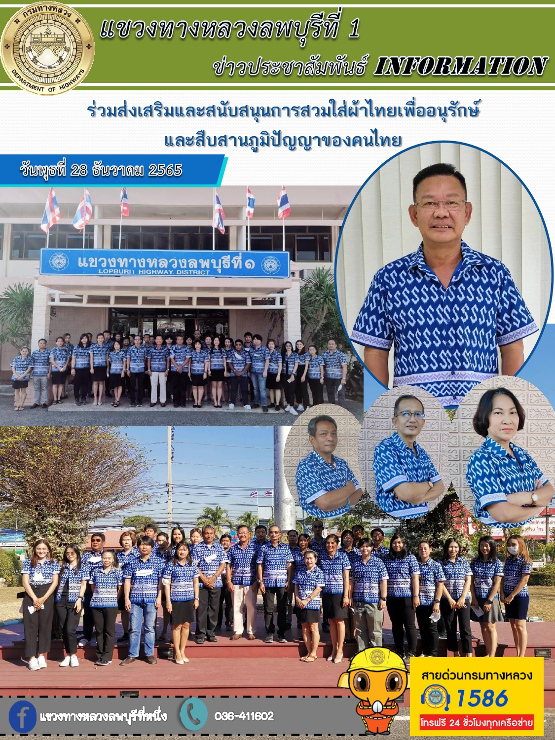 แขวงทางหลวงลพบุรีที่ 1 ร่วมส่งเสริมและสนับสนุนการสวมใส่ผ้าไทยเพื่ออนุรักษ์ และสืบสานภูมิปัญญาของคนไทย