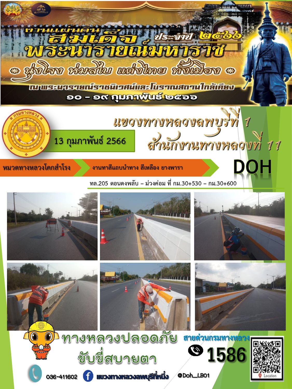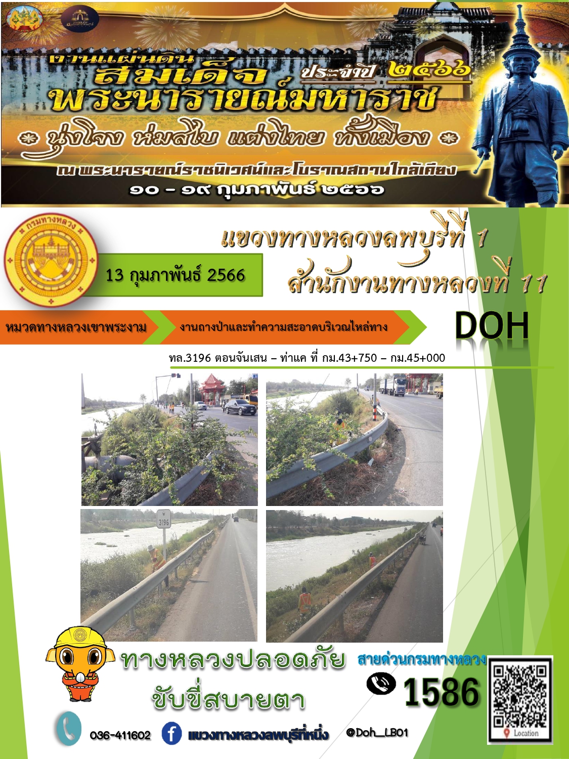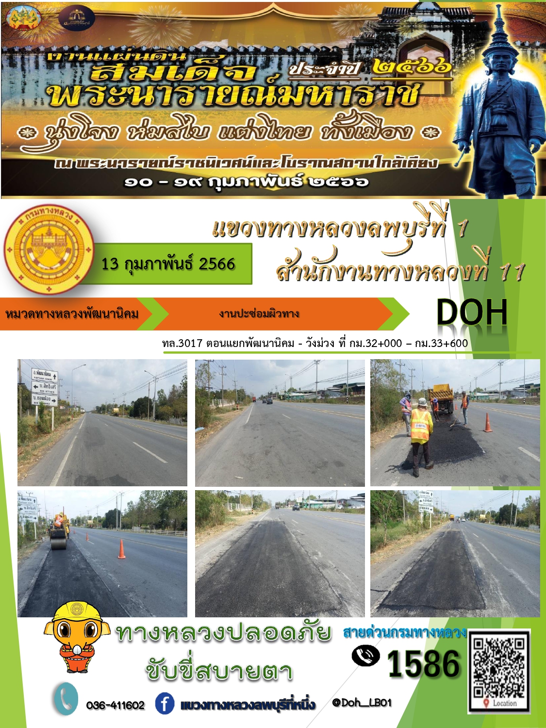 ทางหลวงปลอดภัยขับขี่สบายตา แขวงทางหลวงลพบุรีที่ 1 ประจำวันที่ 13 กุมภาพันธ์ 2566