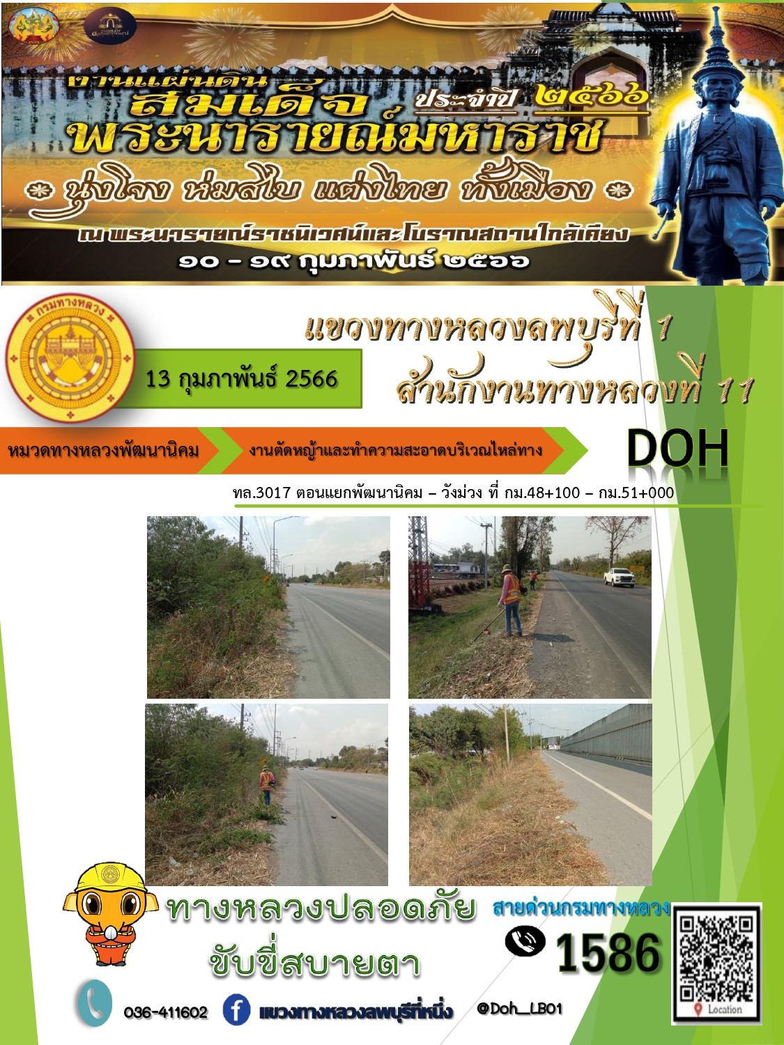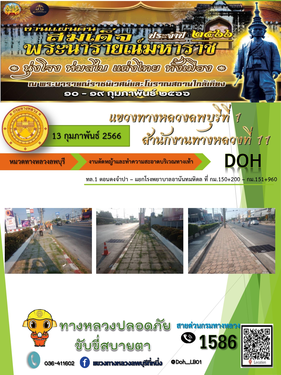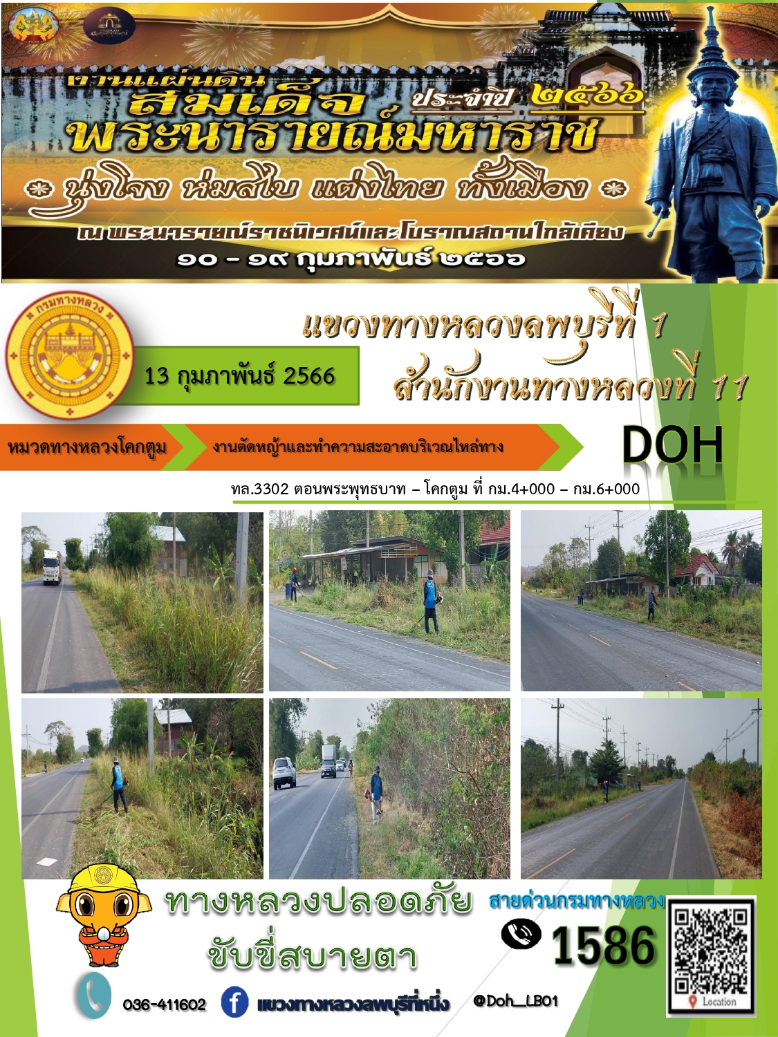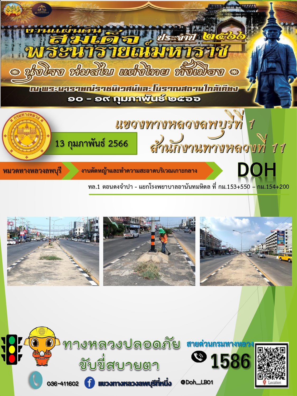 ทางหลวงปลอดภัยขับขี่สบายตา แขวงทางหลวงลพบุรีที่ 1 ประจำวันที่ 13 กุมภาพันธ์ 2566