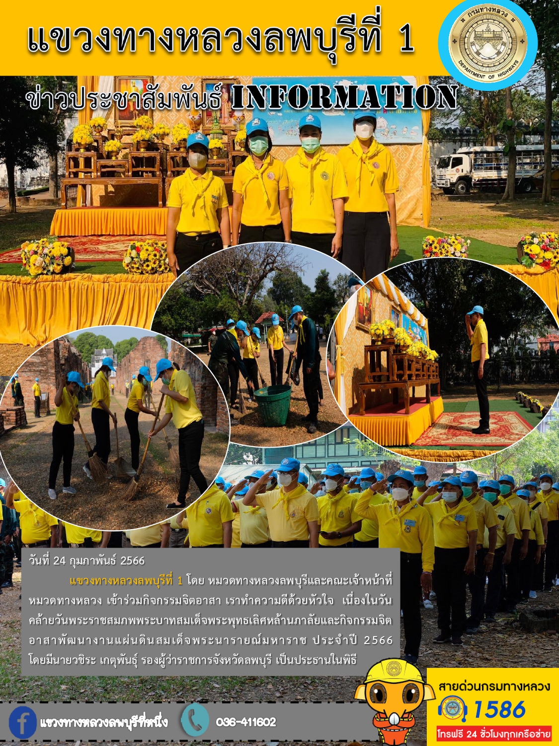 แขวงทางหลวงลพบุรีที่ 1 โดย หมวดทางหลวงลพบุรีและคณะเจ้าหน้าที่หมวดทางหลวง เข้าร่วมกิจกรรมจิตอาสา เราทำความดีด้วยหัวใจ เนื่องในวันคล้ายวันพระราชสมภพพระบาทสมเด็จพระพุทธเลิศหล้านภาลัยและกิจกรรมจิตอาสาพัฒนางานแผ่นดินสมเด็จพระนารายณ์มหาราช ประจำปี 2566 โดยมีนายวชิระ เกตุพันธุ์ รองผู้ว่าราชการจังหวัดลพบุรี เป็นประธานในพิธี