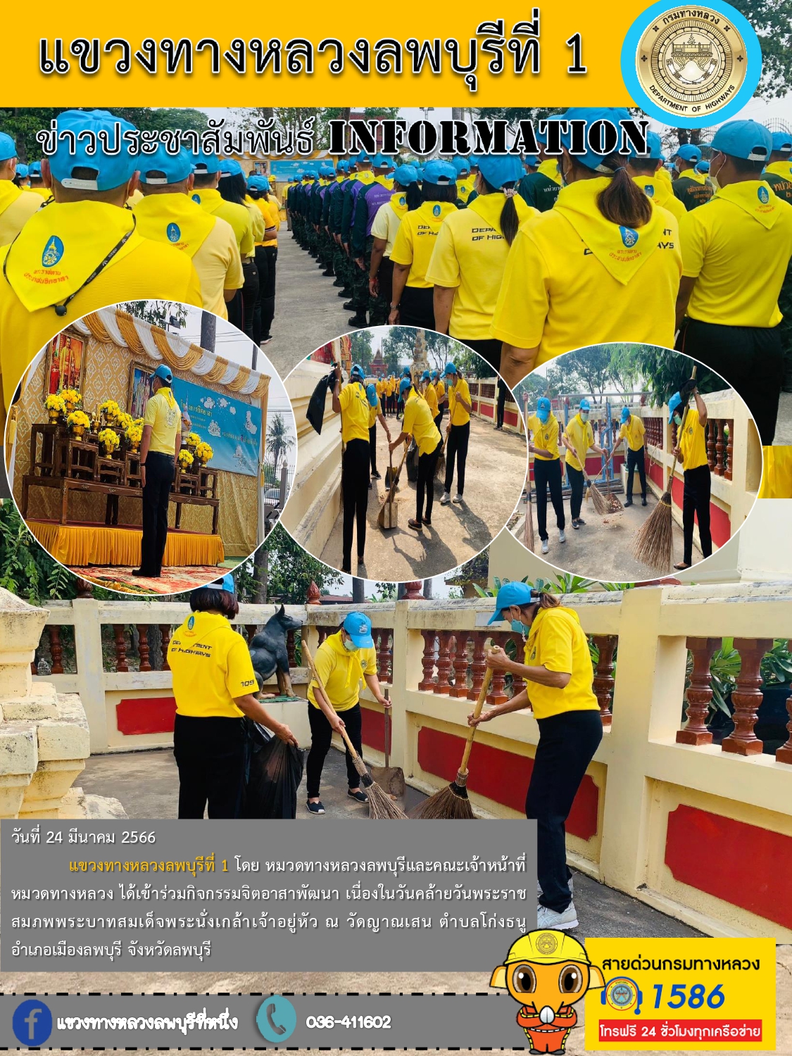 แขวงทางหลวงลพบุรีที่ 1 โดย หมวดทางหลวงลพบุรีและคณะเจ้าหน้าที่หมวดทางหลวง ได้เข้าร่วมกิจกรรมจิตอาสาพัฒนา เนื่องในวันคล้ายวันพระราชสมภพพระบาทสมเด็จพระนั่งเกล้าเจ้าอยู่หัว ณ วัดญาณเสน ตำบลโก่งธนู อำเภอเมืองลพบุรี จังหวัดลพบุรี