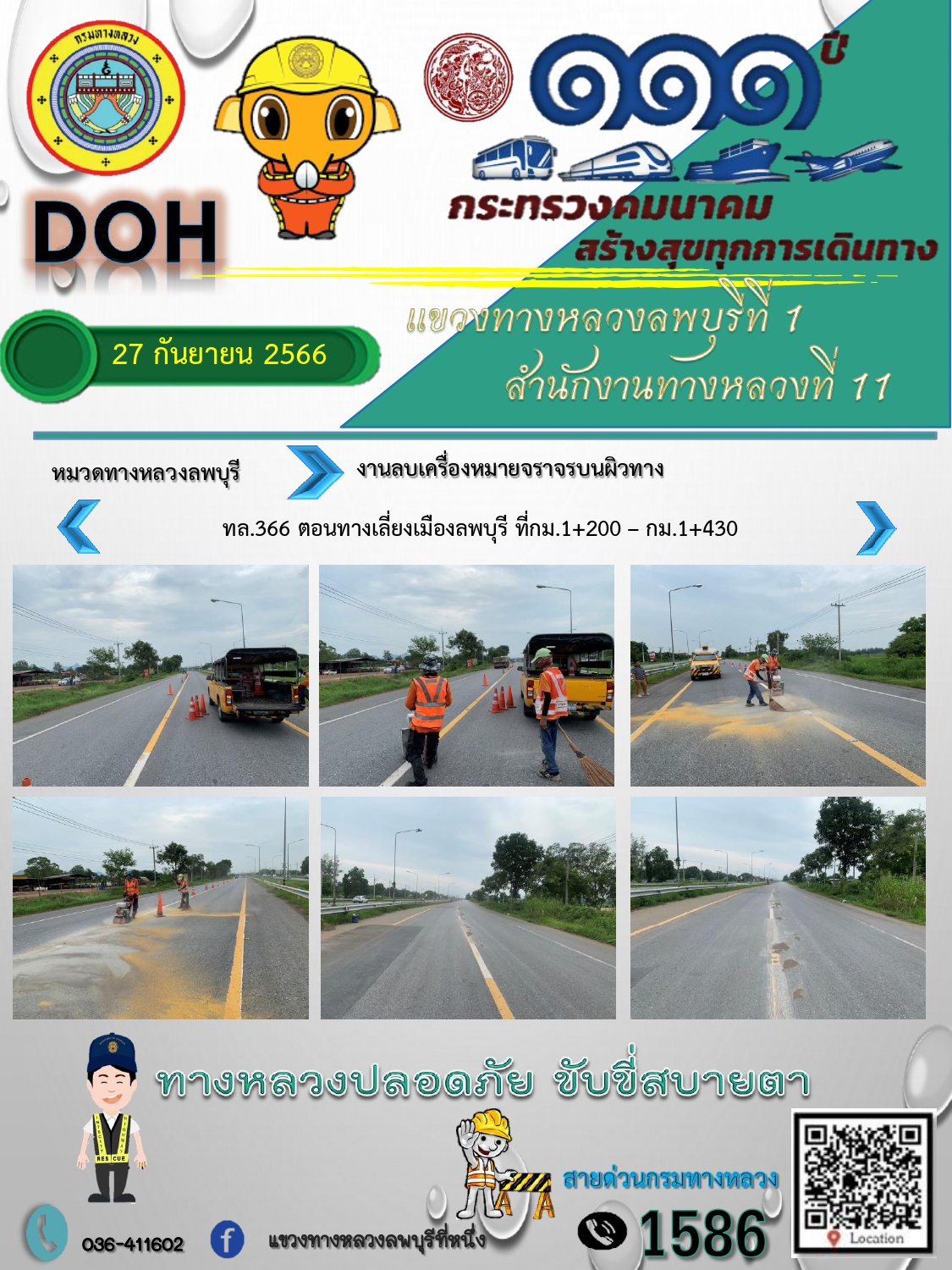 ทางหลวงปลอดภัยขับขี่สบายตา แขวงทางหลวงลพบุรีที่ 1 ประจำวันที่ 27 กันยายน 2566