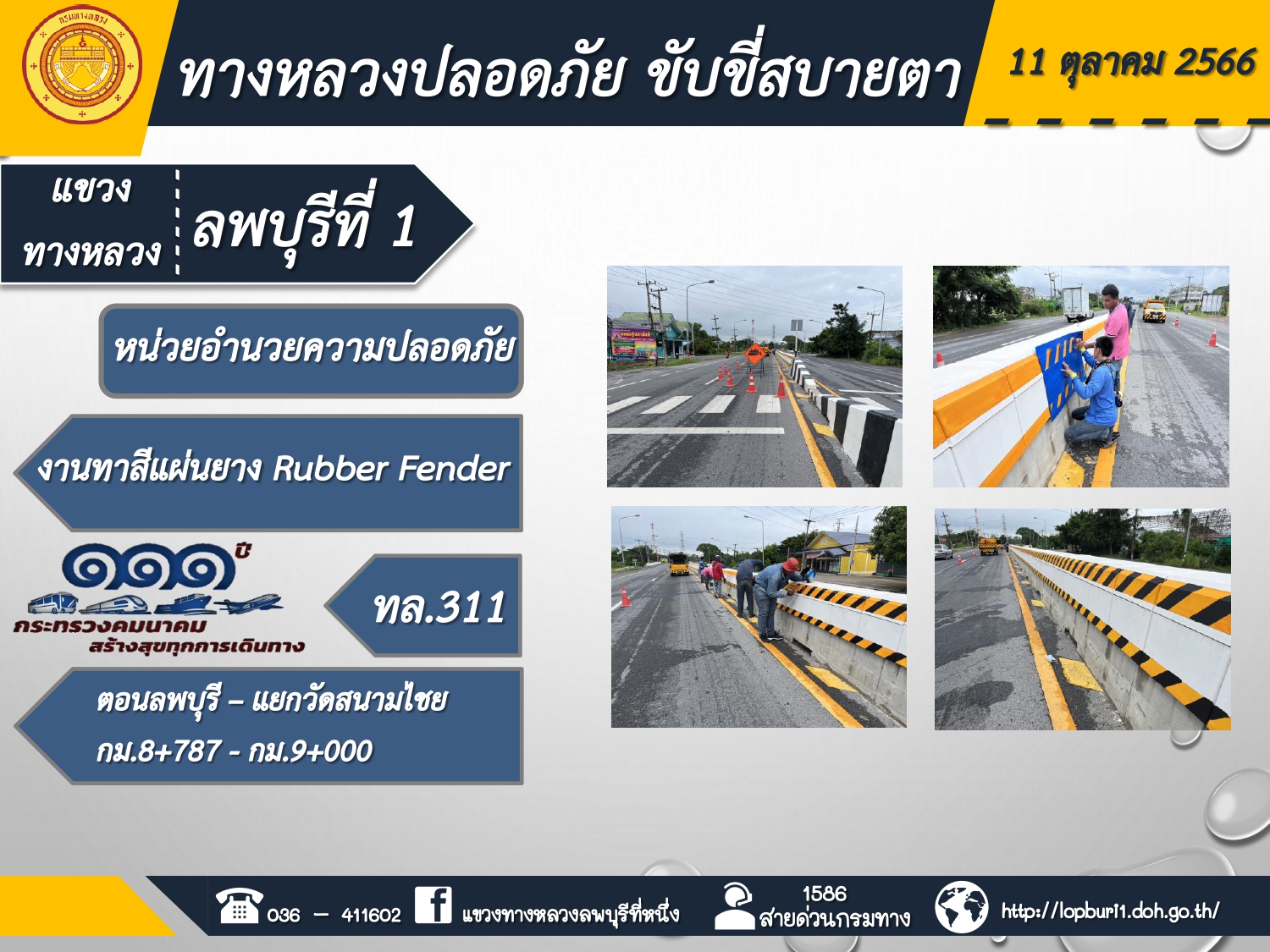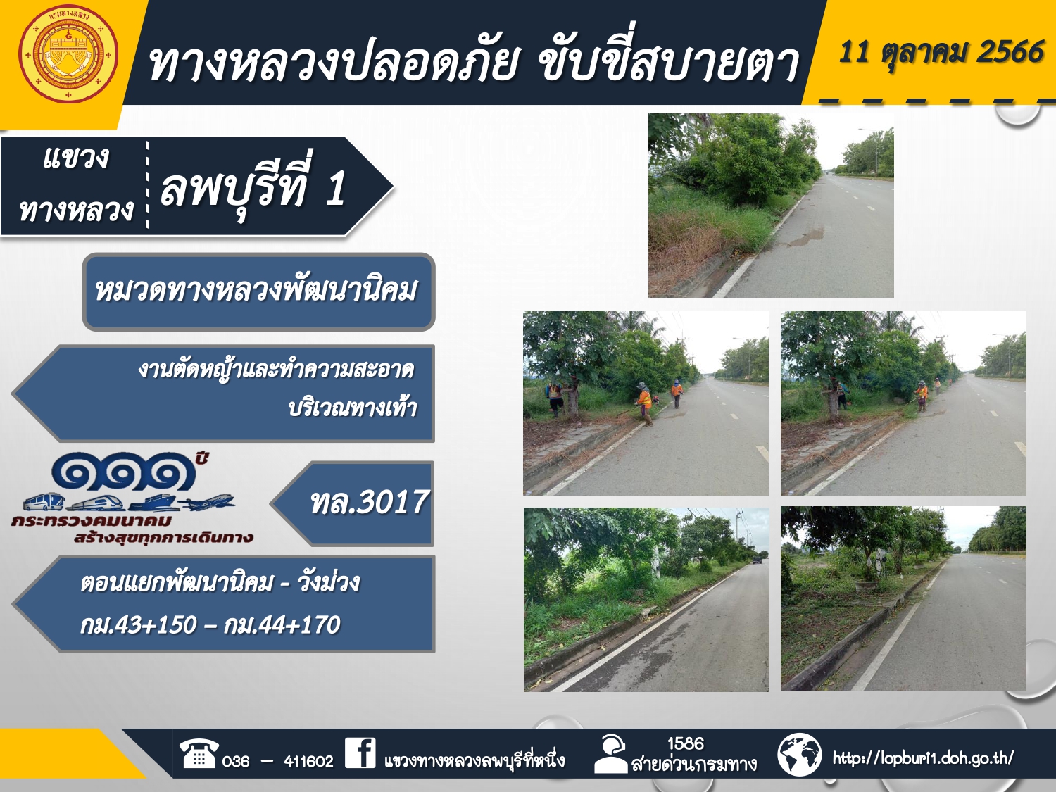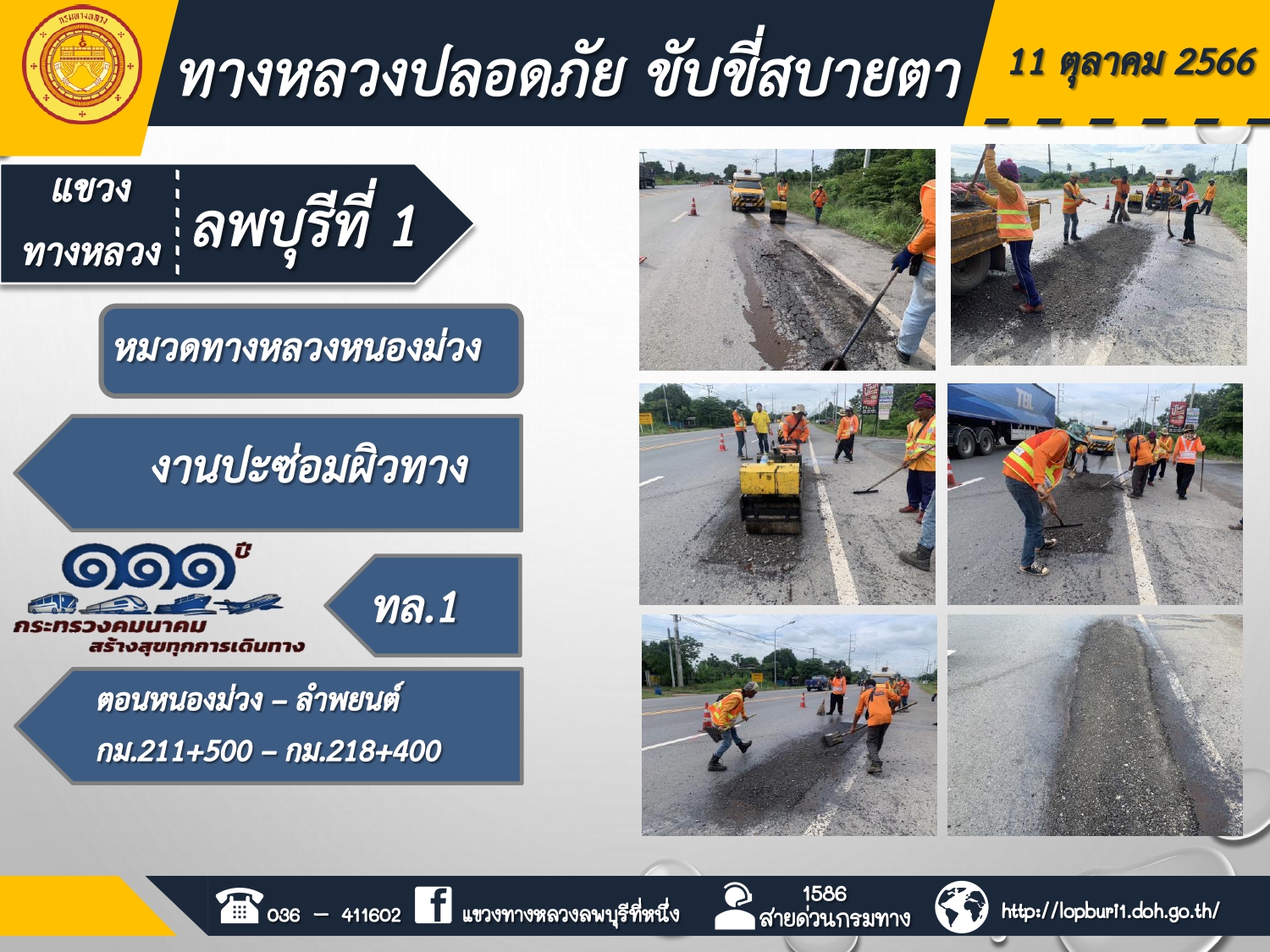 ทางหลวงปลอดภัยขับขี่สบายตา แขวงทางหลวงลพบุรีที่ 1 ประจำวันที่ 11 ตุลาคม 2566