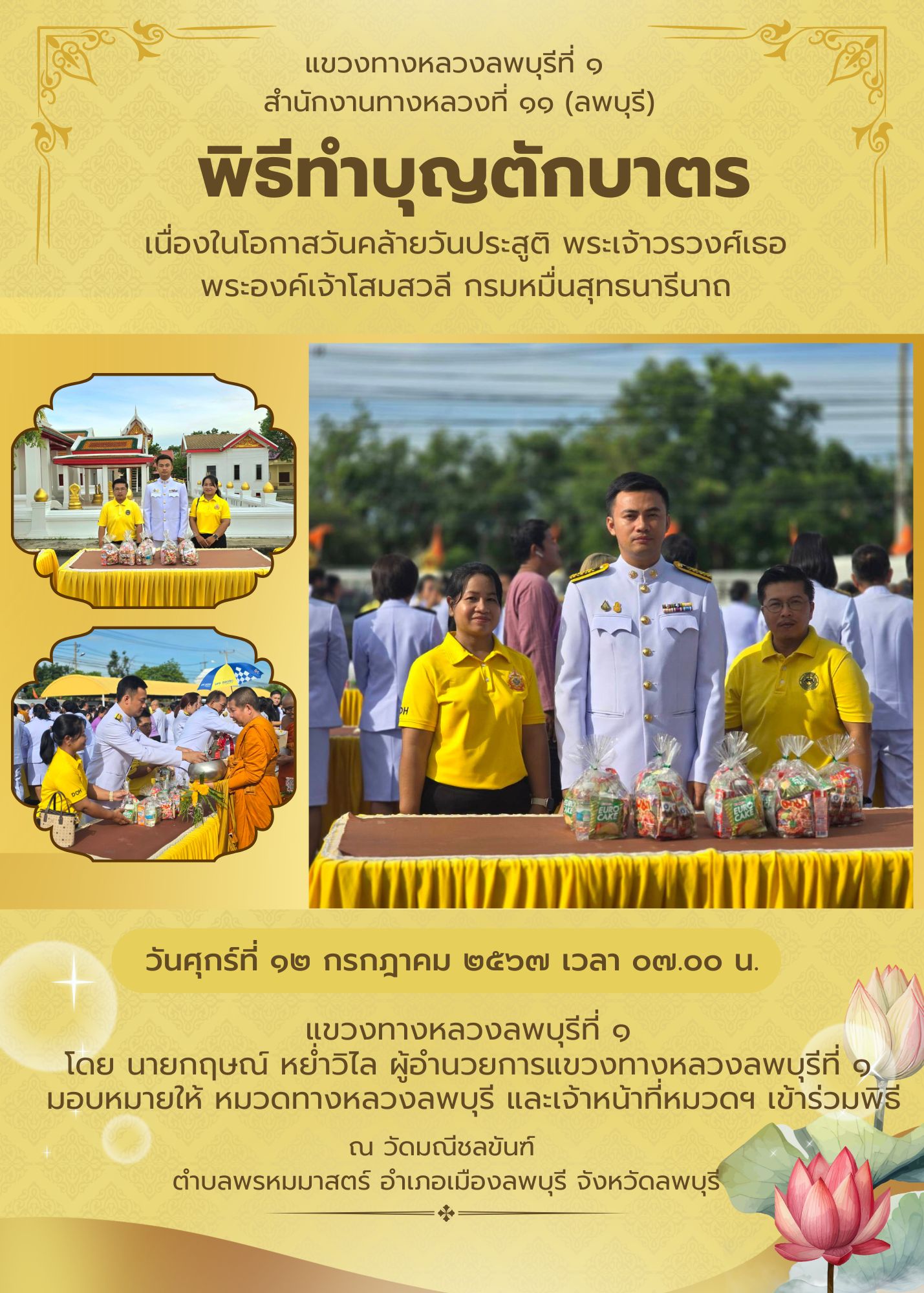 แขวงทางหลวงลพบุรีที่ 1 โดย นายกฤษณ์ หย่ำวิไล ผู้อำนวยการแขวงทางหลวงลพบุรีที่ 1 มอบหมายให้ หมวดทางหลวงลพบุรี เข้าร่วมพิธีตักบาตรพระสงฆ์ เนื่องในโอกาสวันคล้ายวันประสูติ พระเจ้าวรวงศ์เธอ พระองค์เจ้าโสมสวลี กรมหมื่นสุทธนารีนาถ ณ วัดมณีชลขันฑ์ ตำบลพรหมมาสตร์ อำเภอเมืองลพบุรี จังหวัดลพบุรี