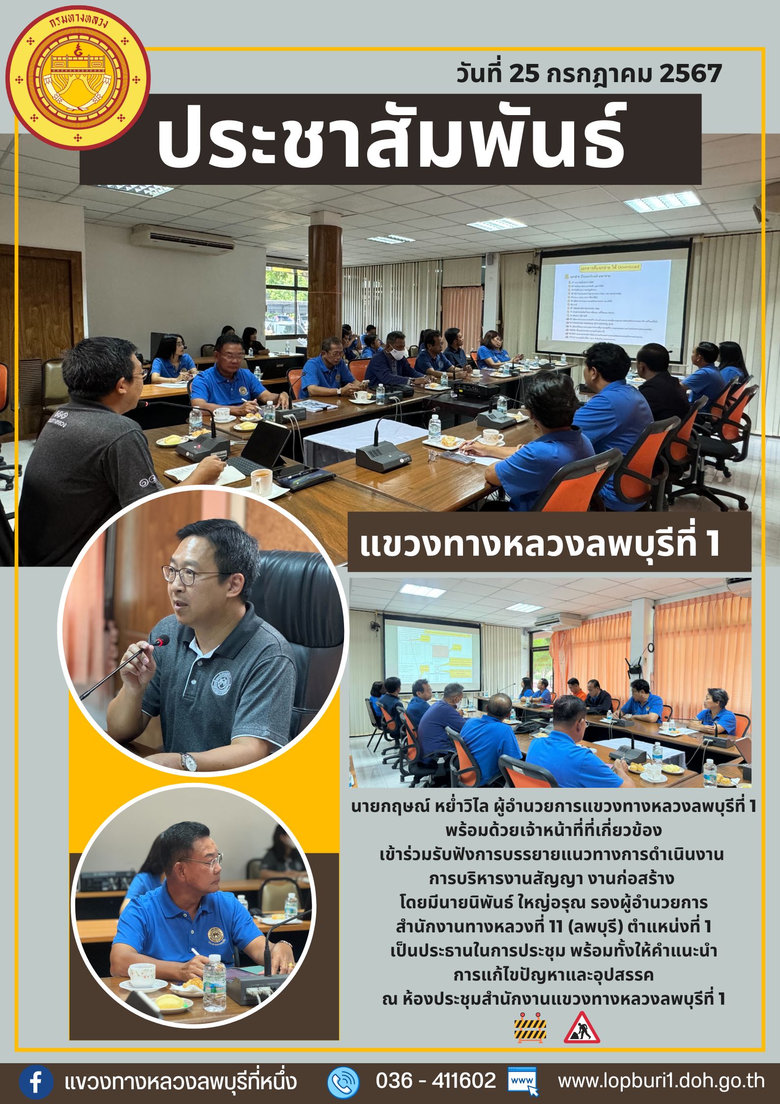 นายกฤษณ์ หย่ำวิไล ผู้อำนวยการแขวงทางหลวงลพบุรีที่ 1 พร้อมด้วยเจ้าหน้าที่ที่เกี่ยวข้องเข้าร่วมรับฟังการบรรยายแนวทางการดำเนินงาน การบริหารงานสัญญา งานก่อสร้าง โดยมีนายนิพันธ์ ใหญ่อรุณ รองผู้อำนวยการสำนักงานทางหลวงที่ 11 (ลพบุรี) ตำแหน่งที่ 1