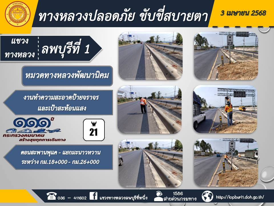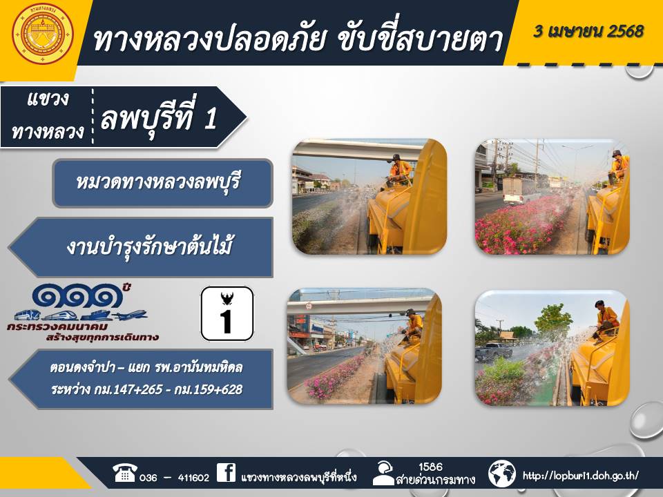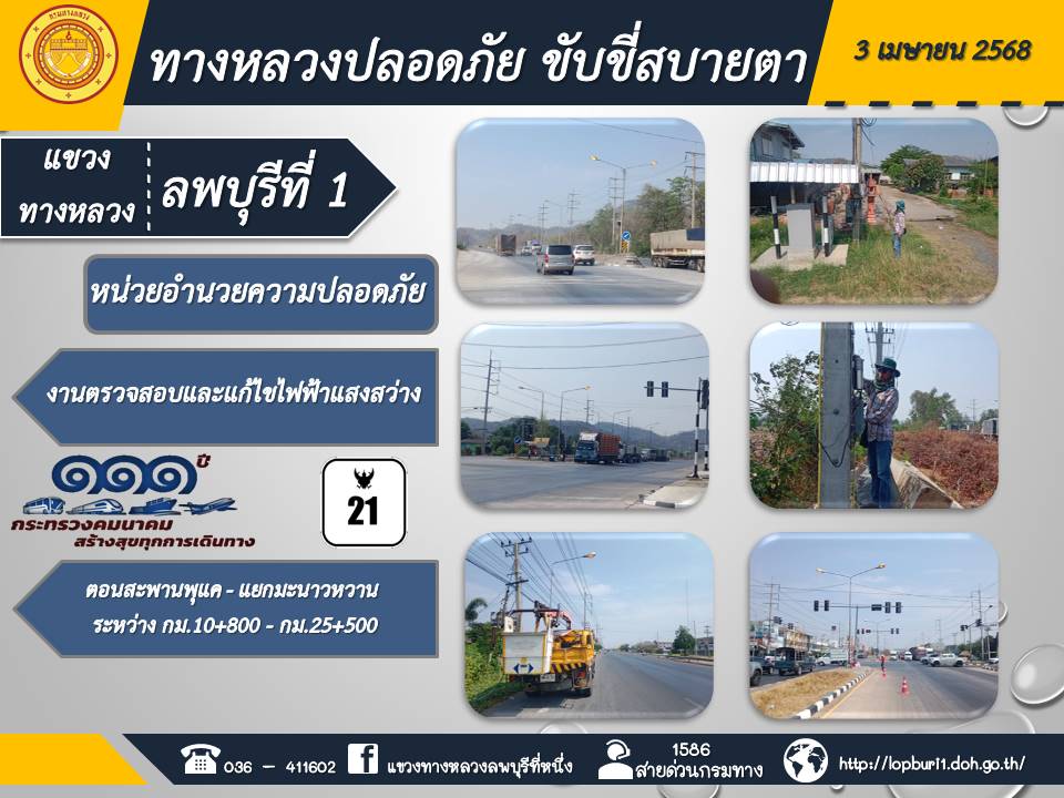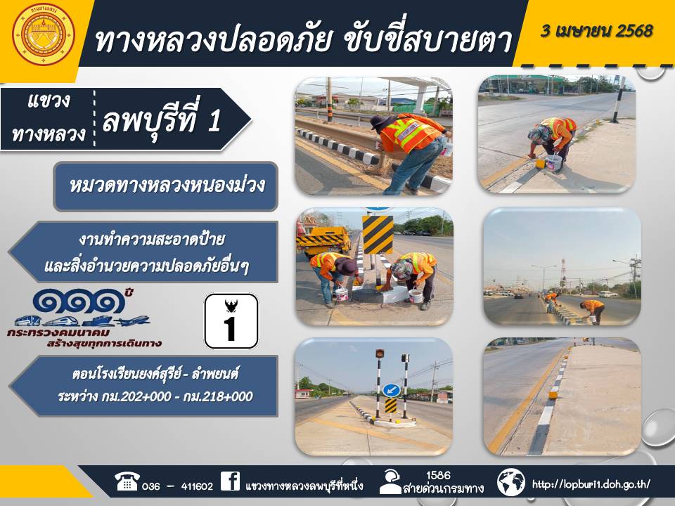 ทางหลวงปลอดภัยขับขี่สบายตา แขวงทางหลวงลพบุรีที่ 1 ประจำวันที่ 3 เมษายน 2568