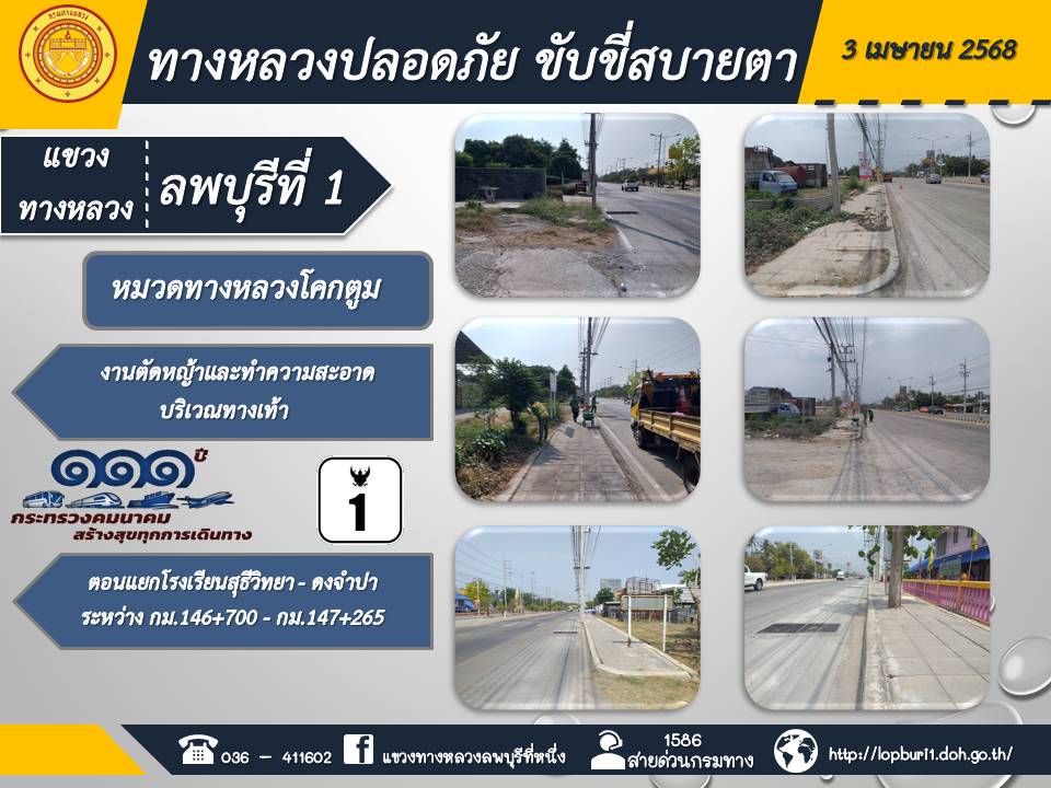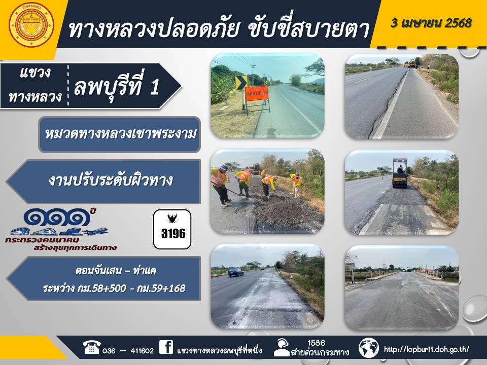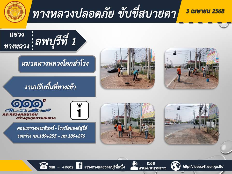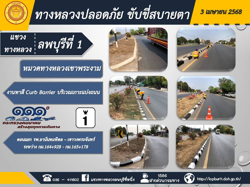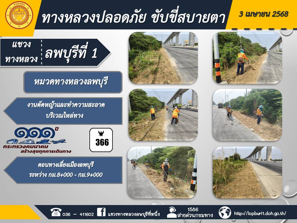 ทางหลวงปลอดภัยขับขี่สบายตา แขวงทางหลวงลพบุรีที่ 1 ประจำวันที่ 3 เมษายน 2568