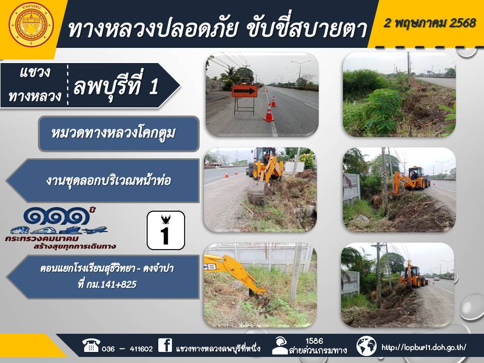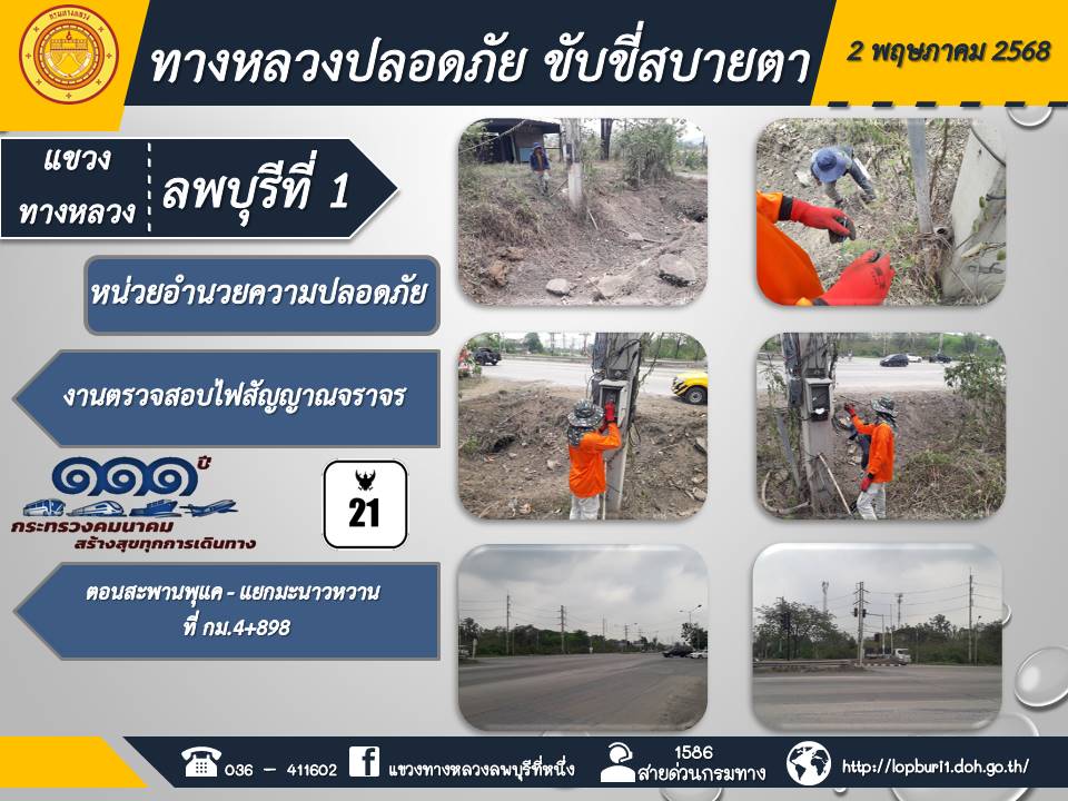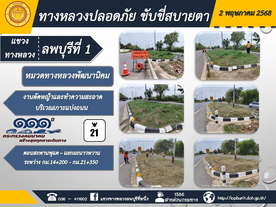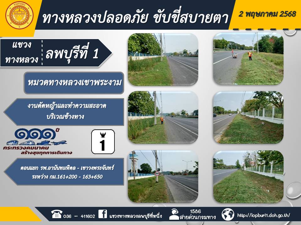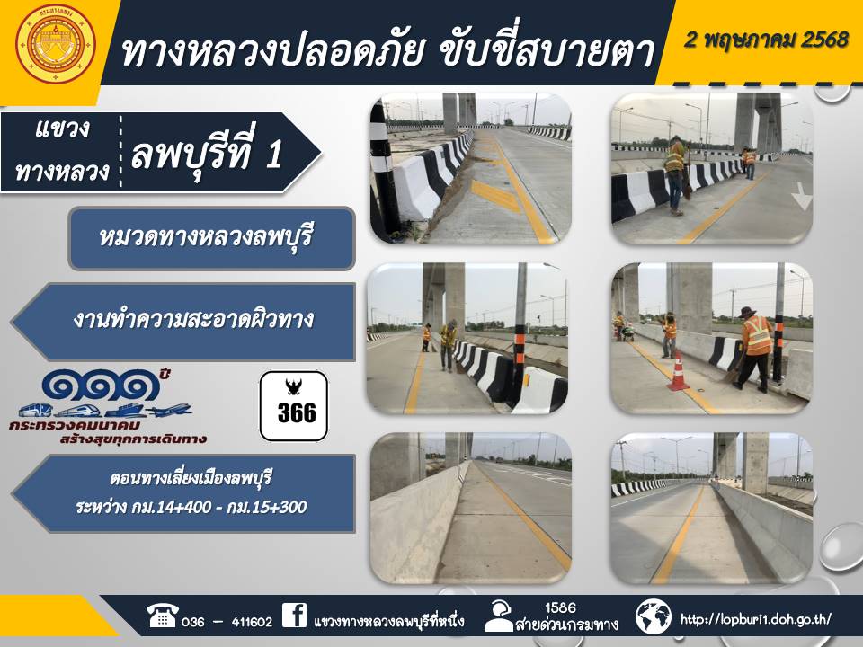 ทางหลวงปลอดภัยขับขี่สบายตา แขวงทางหลวงลพบุรีที่ 1 ประจำวันที่ 2 พฤษภาคม 2568