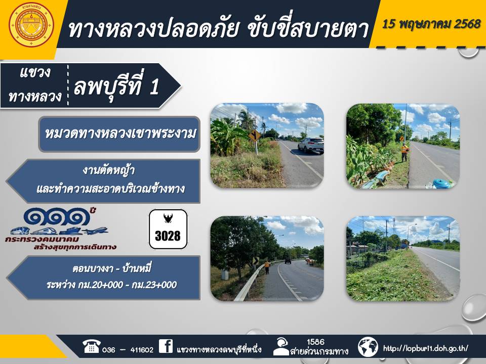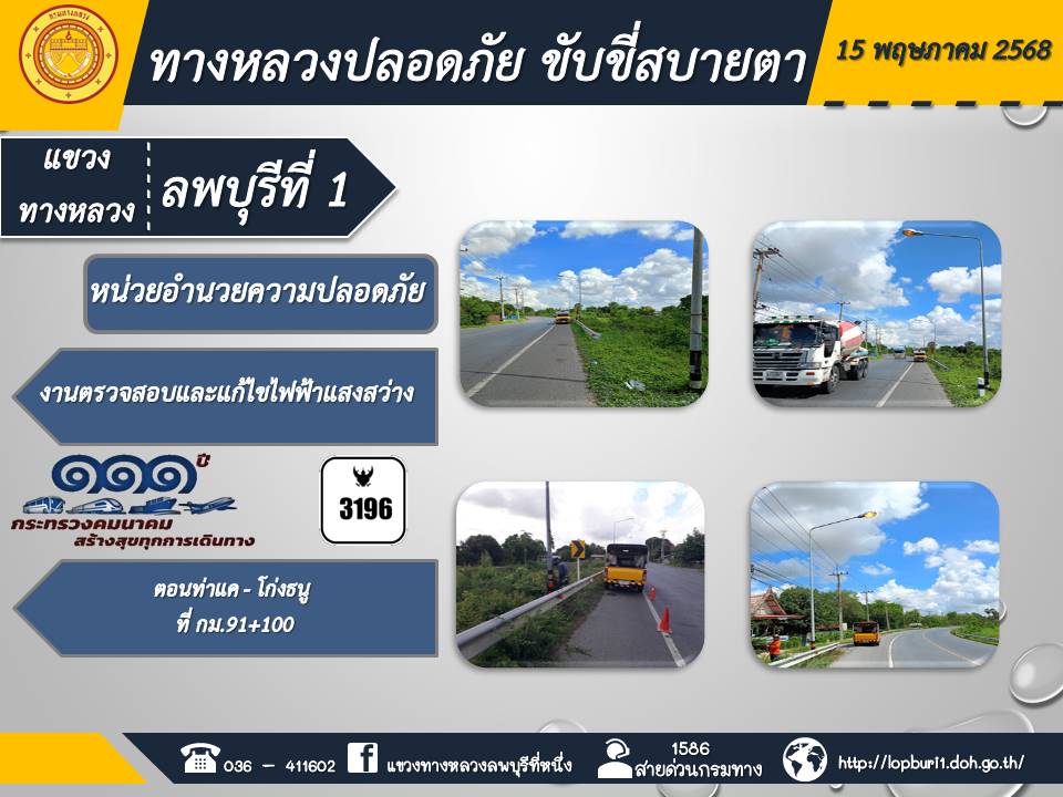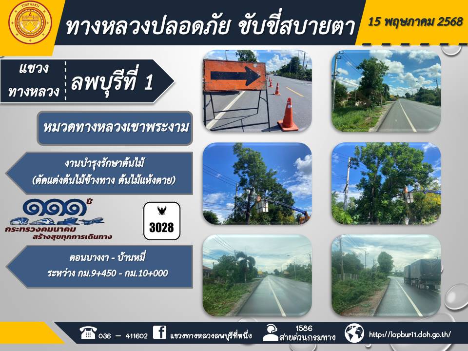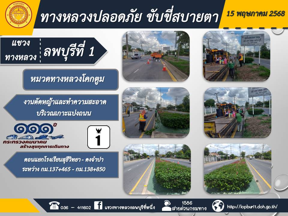 ทางหลวงปลอดภัยขับขี่สบายตา แขวงทางหลวงลพบุรีที่ 1 ประจำวันที่ 15 พฤษภาคม 2568