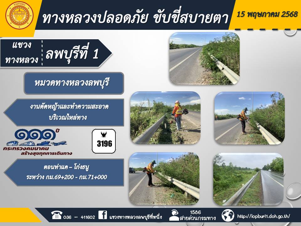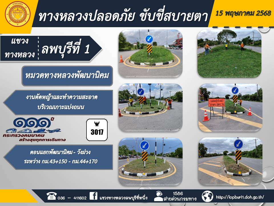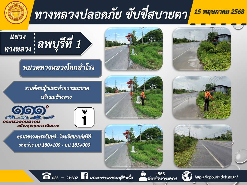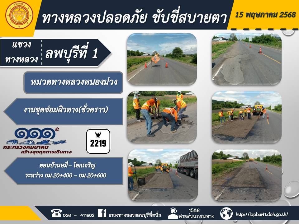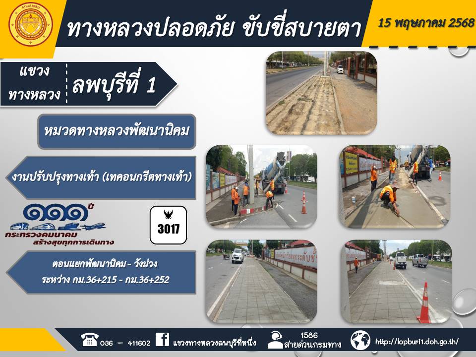 ทางหลวงปลอดภัยขับขี่สบายตา แขวงทางหลวงลพบุรีที่ 1 ประจำวันที่ 15 พฤษภาคม 2568