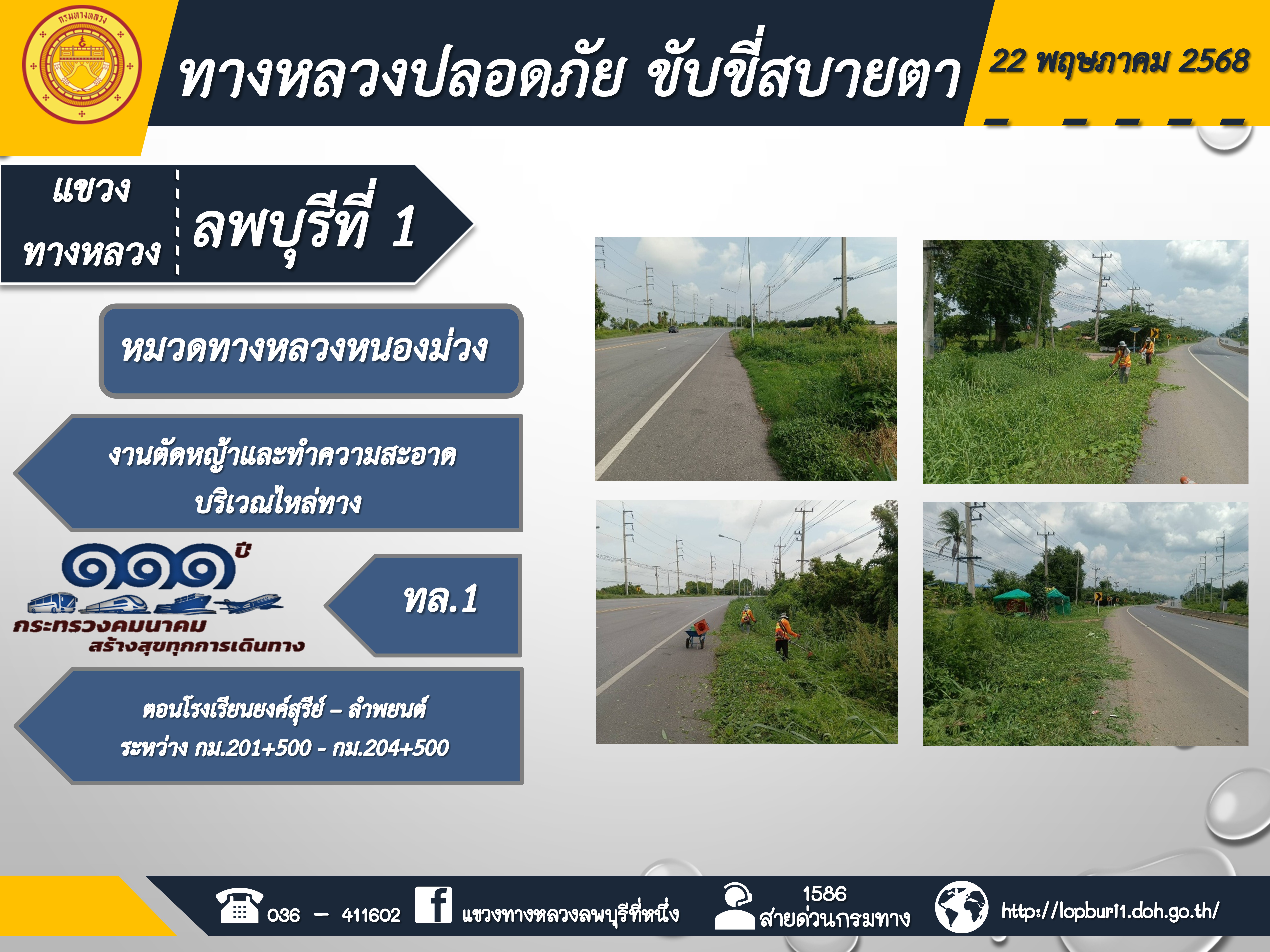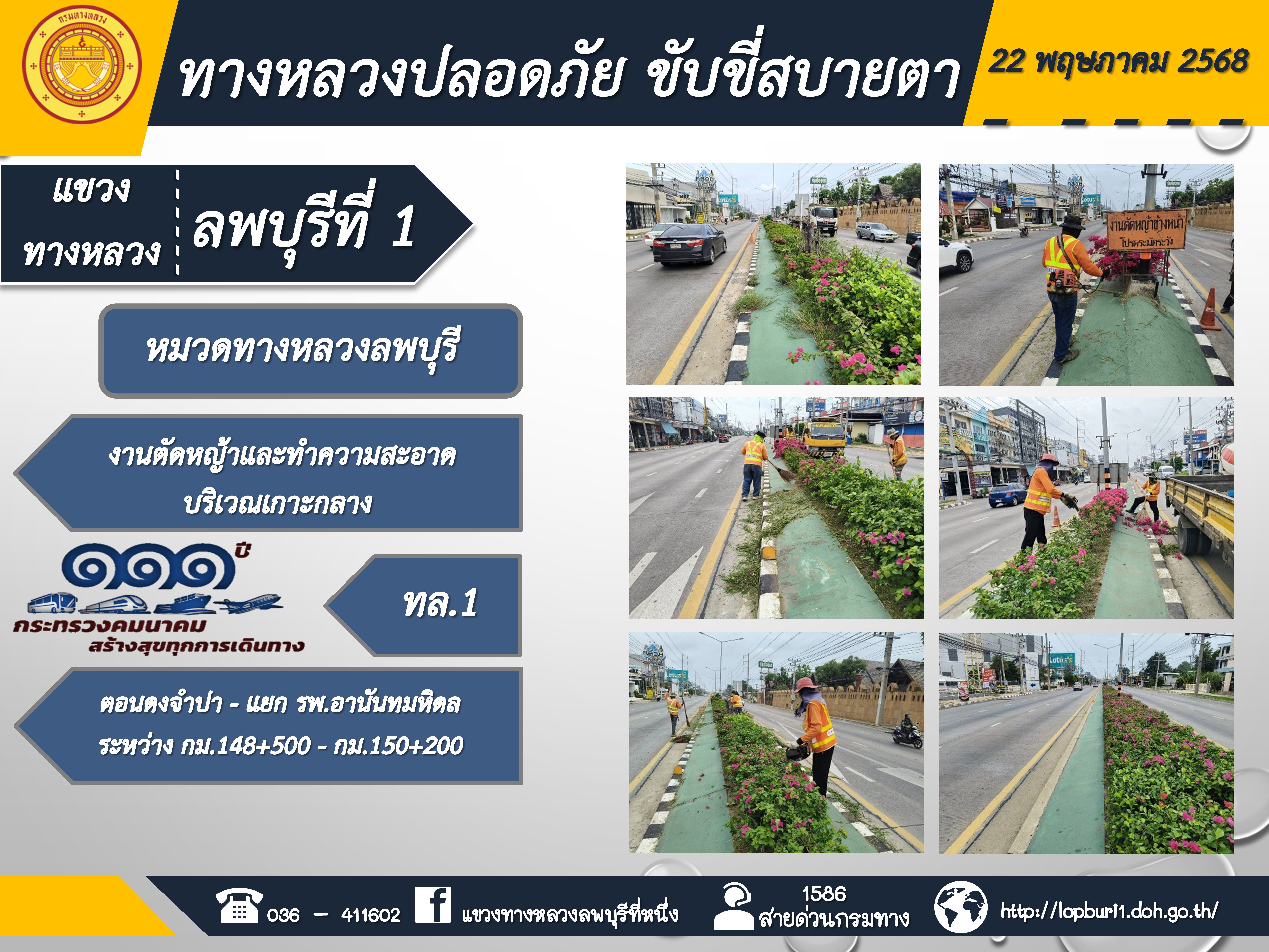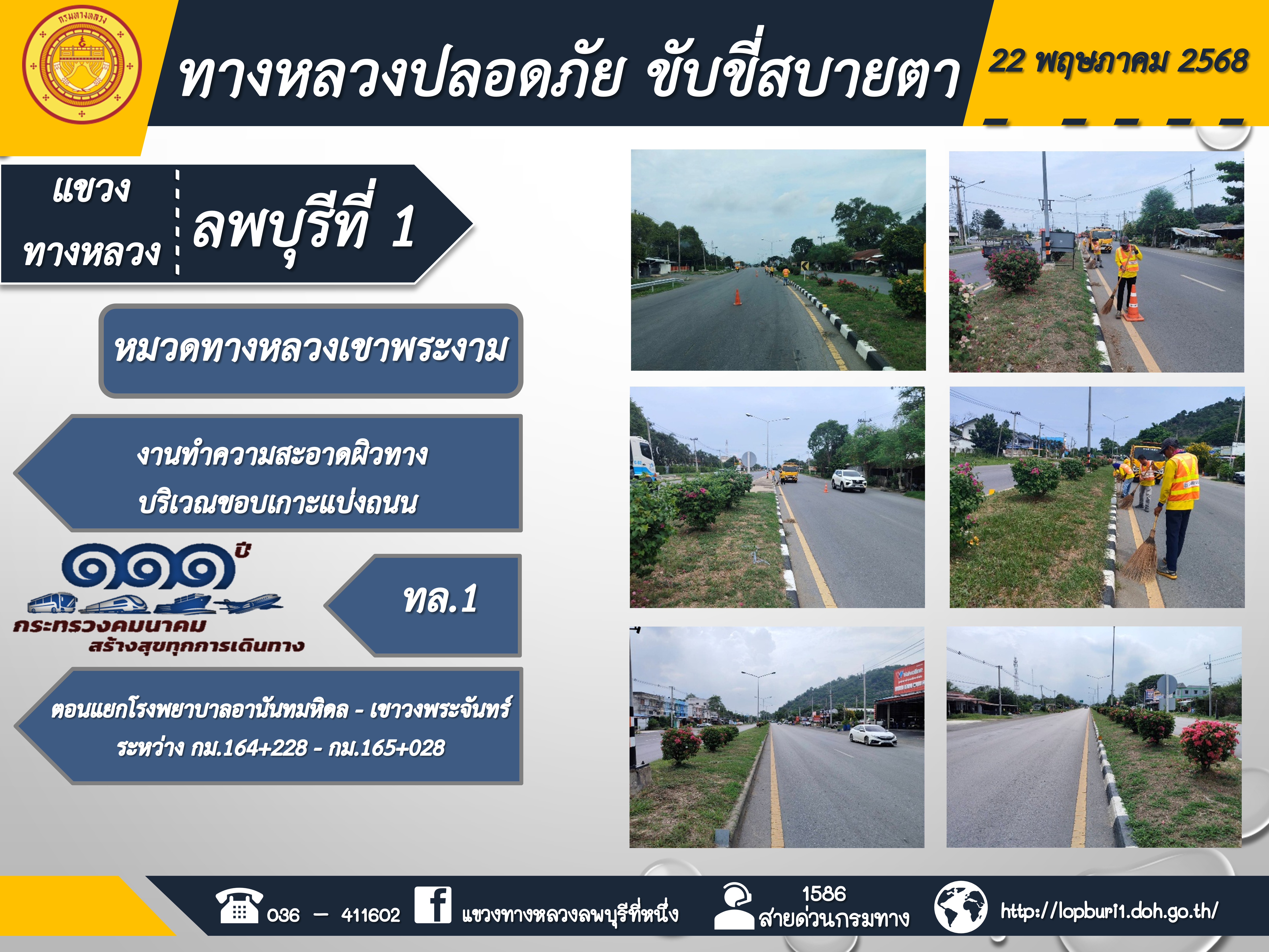 ทางหลวงปลอดภัยขับขี่สบายตา แขวงทางหลวงลพบุรีที่ 1 ประจำวันที่ 22 พฤษภาคม 2568