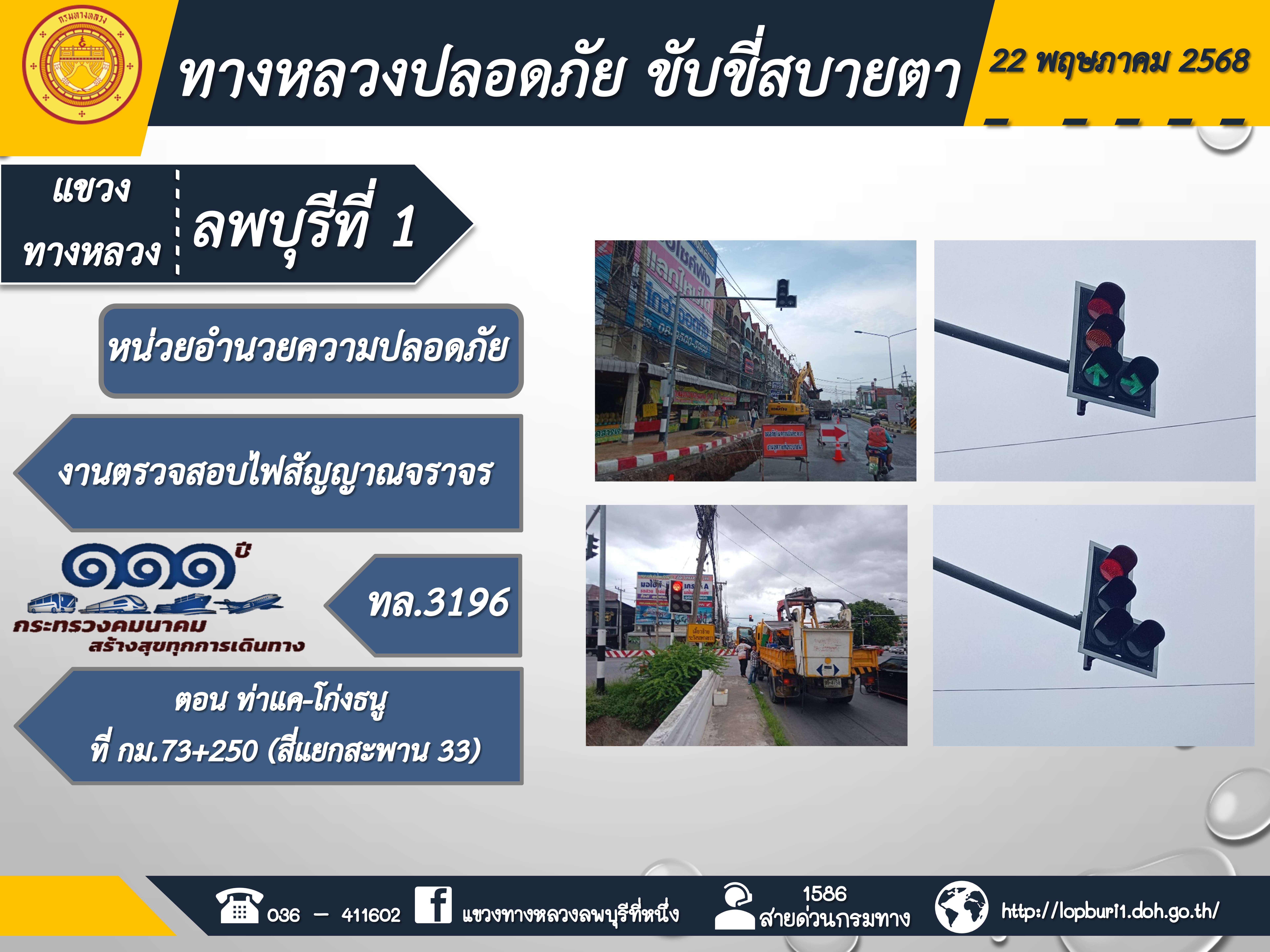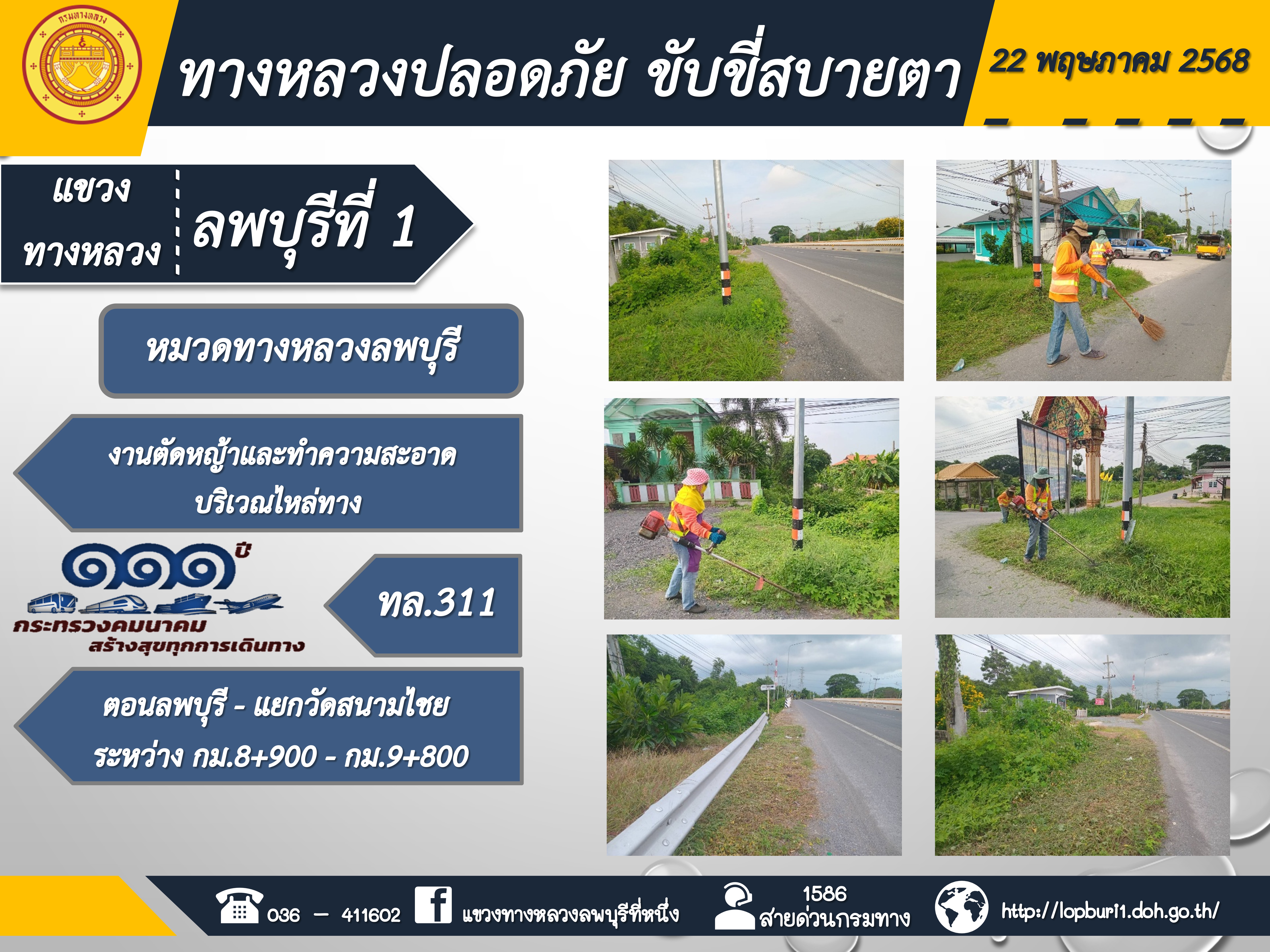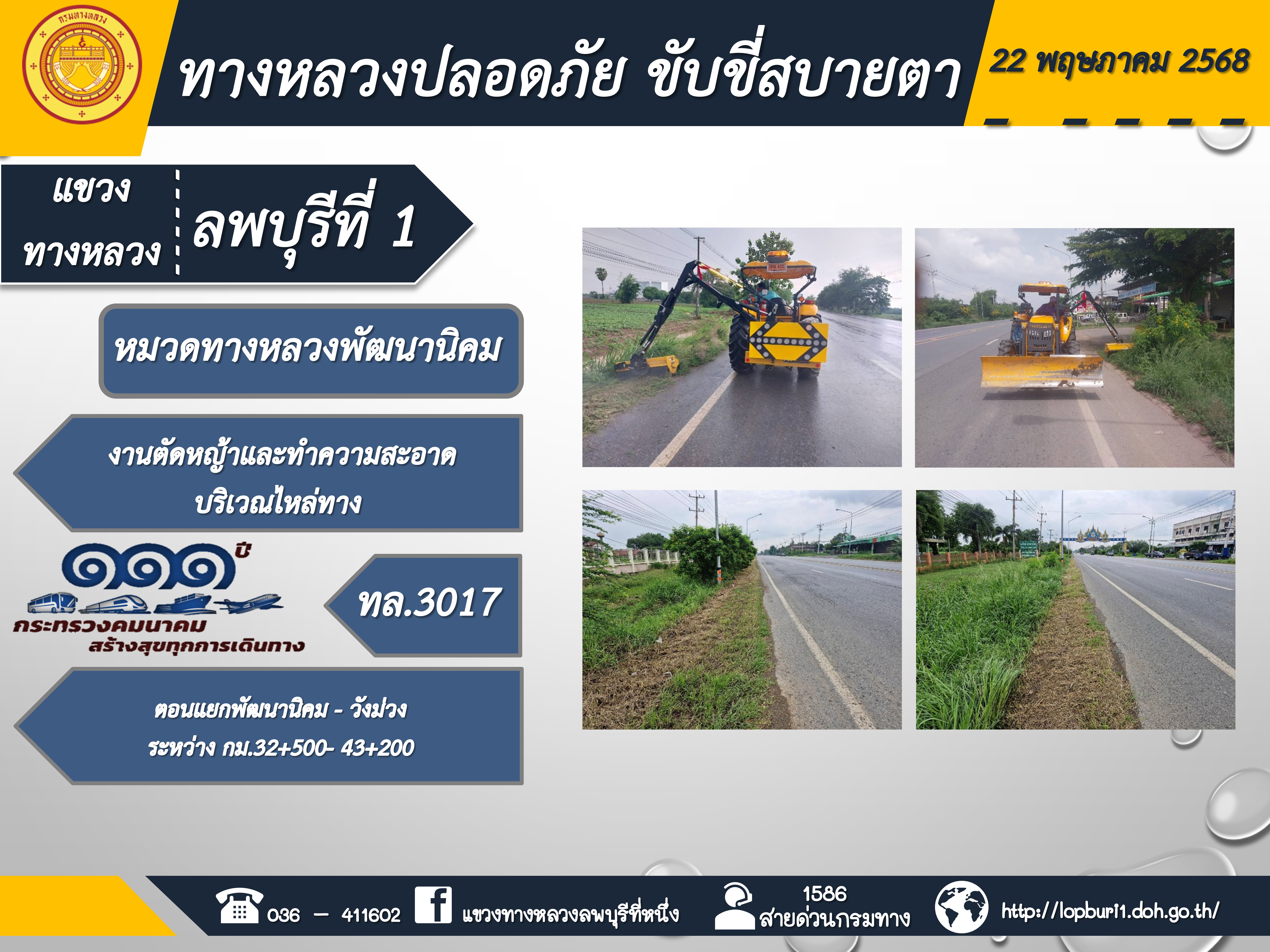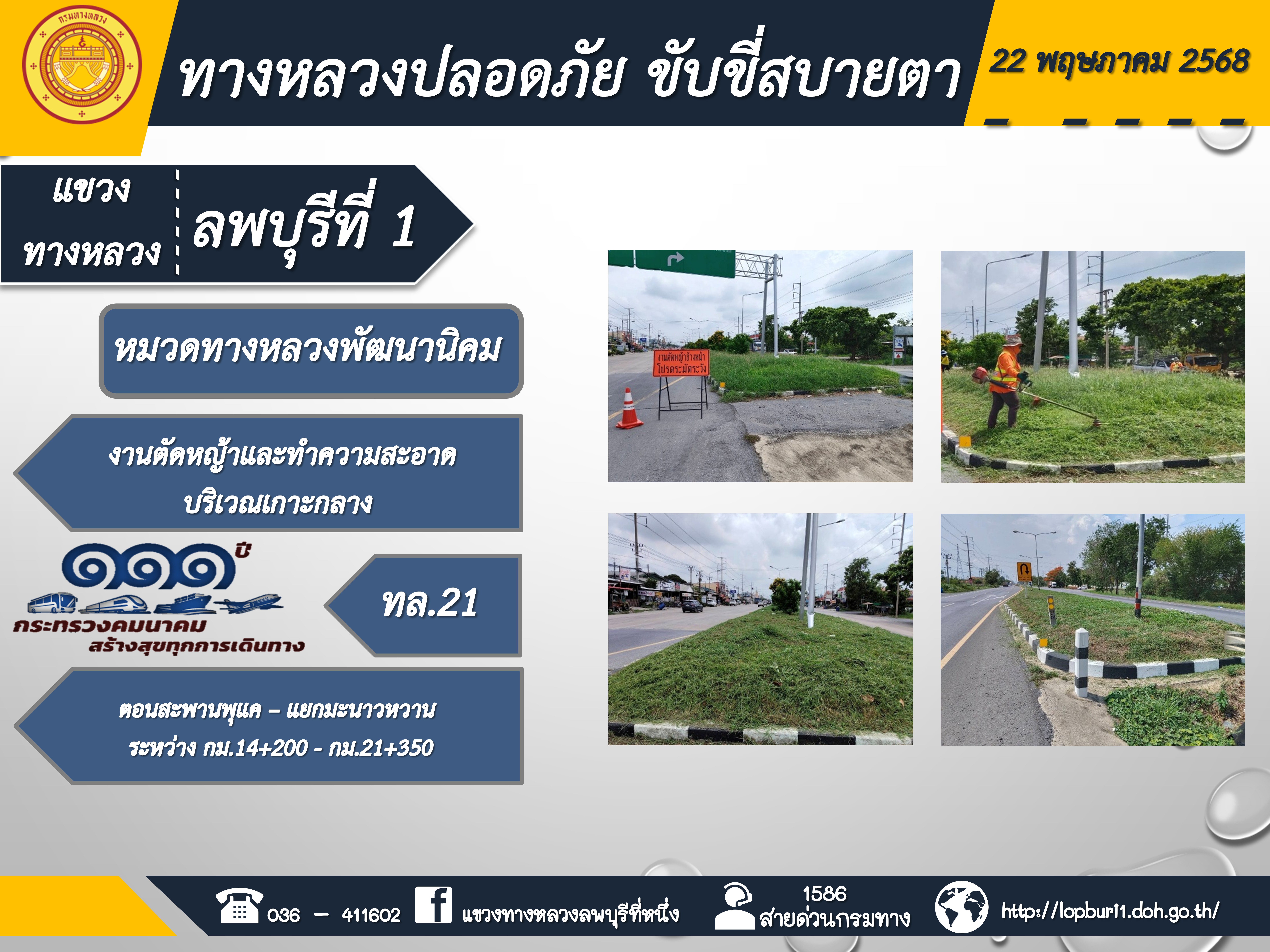 ทางหลวงปลอดภัยขับขี่สบายตา แขวงทางหลวงลพบุรีที่ 1 ประจำวันที่ 22 พฤษภาคม 2568