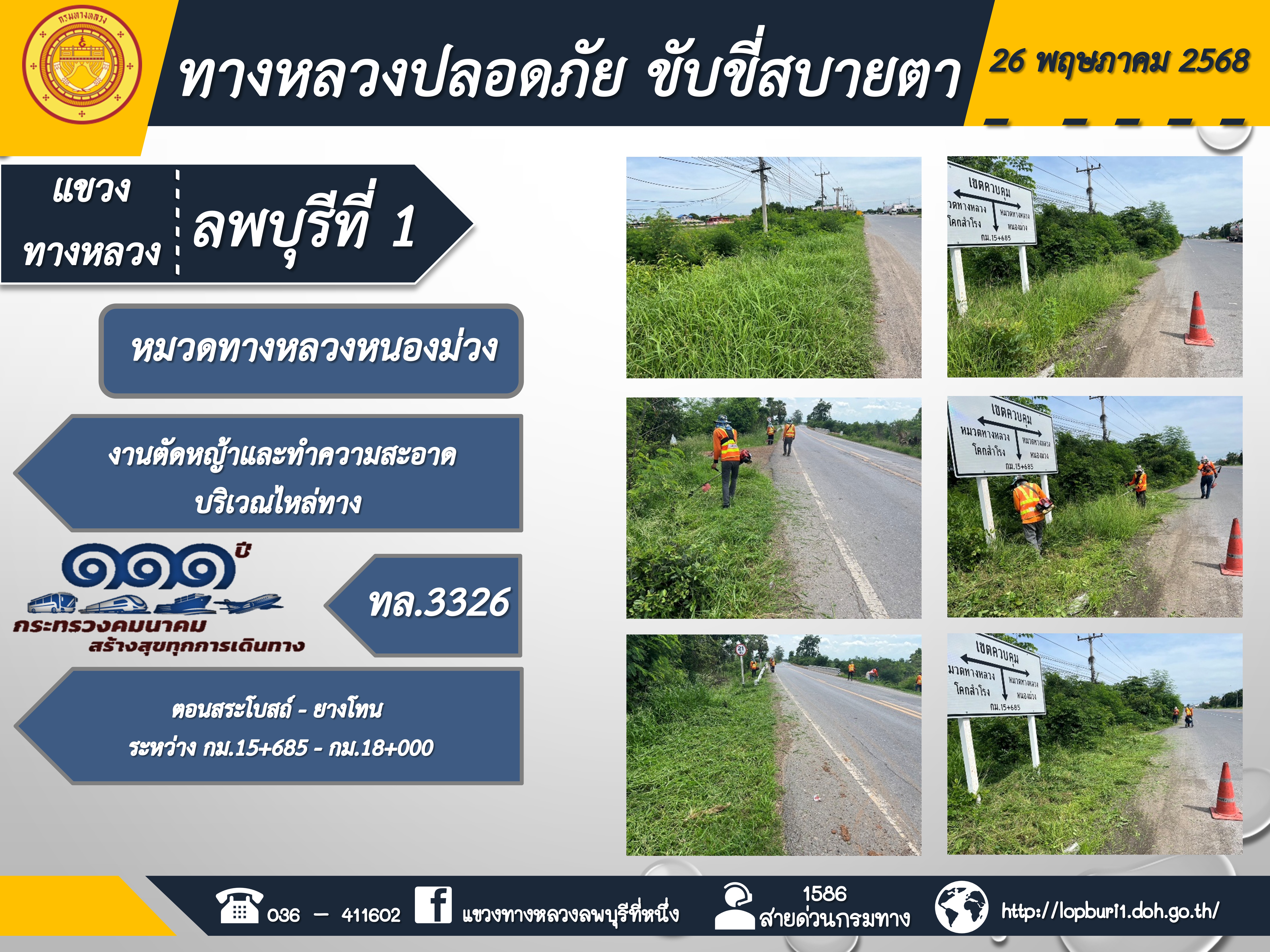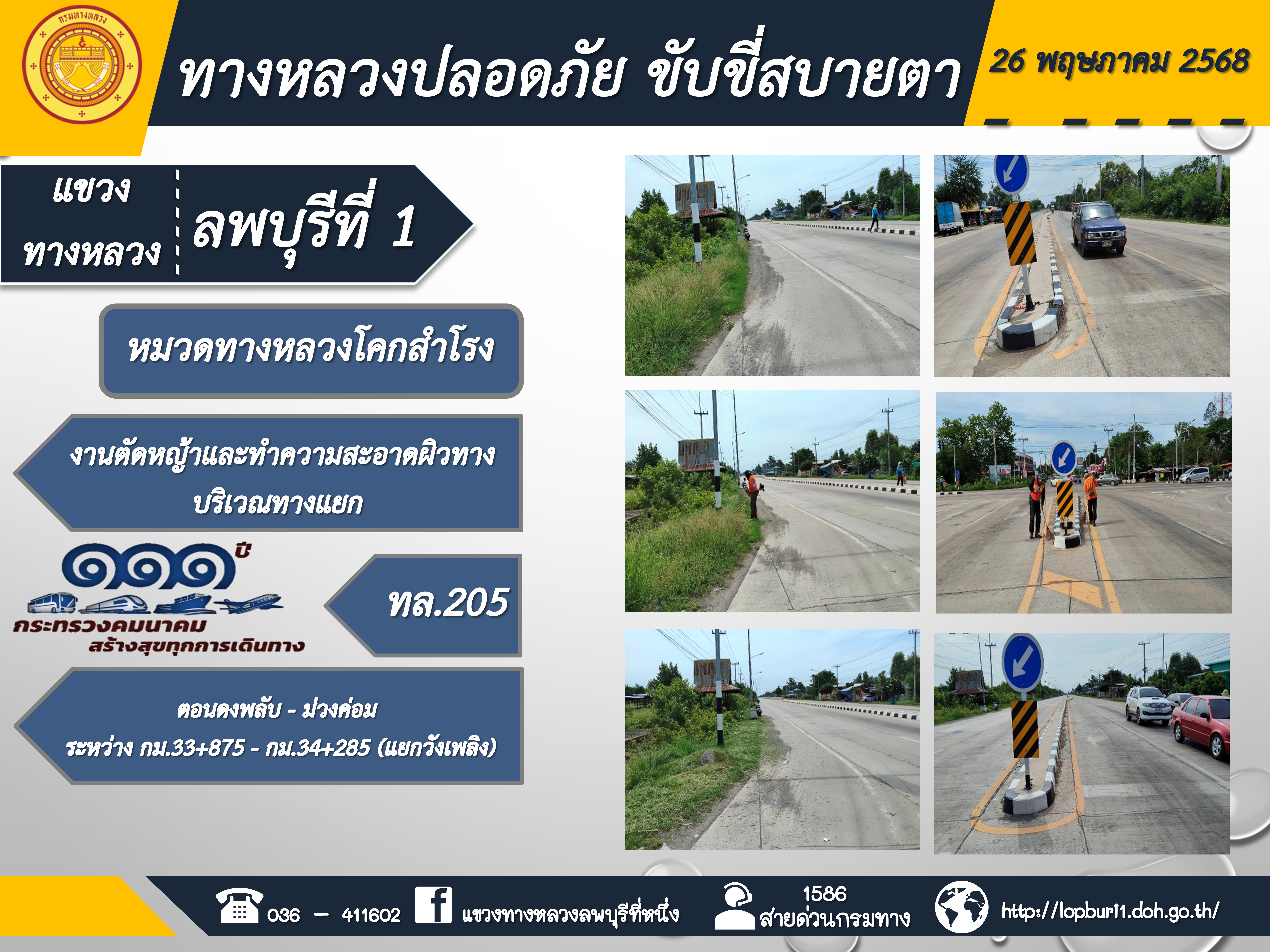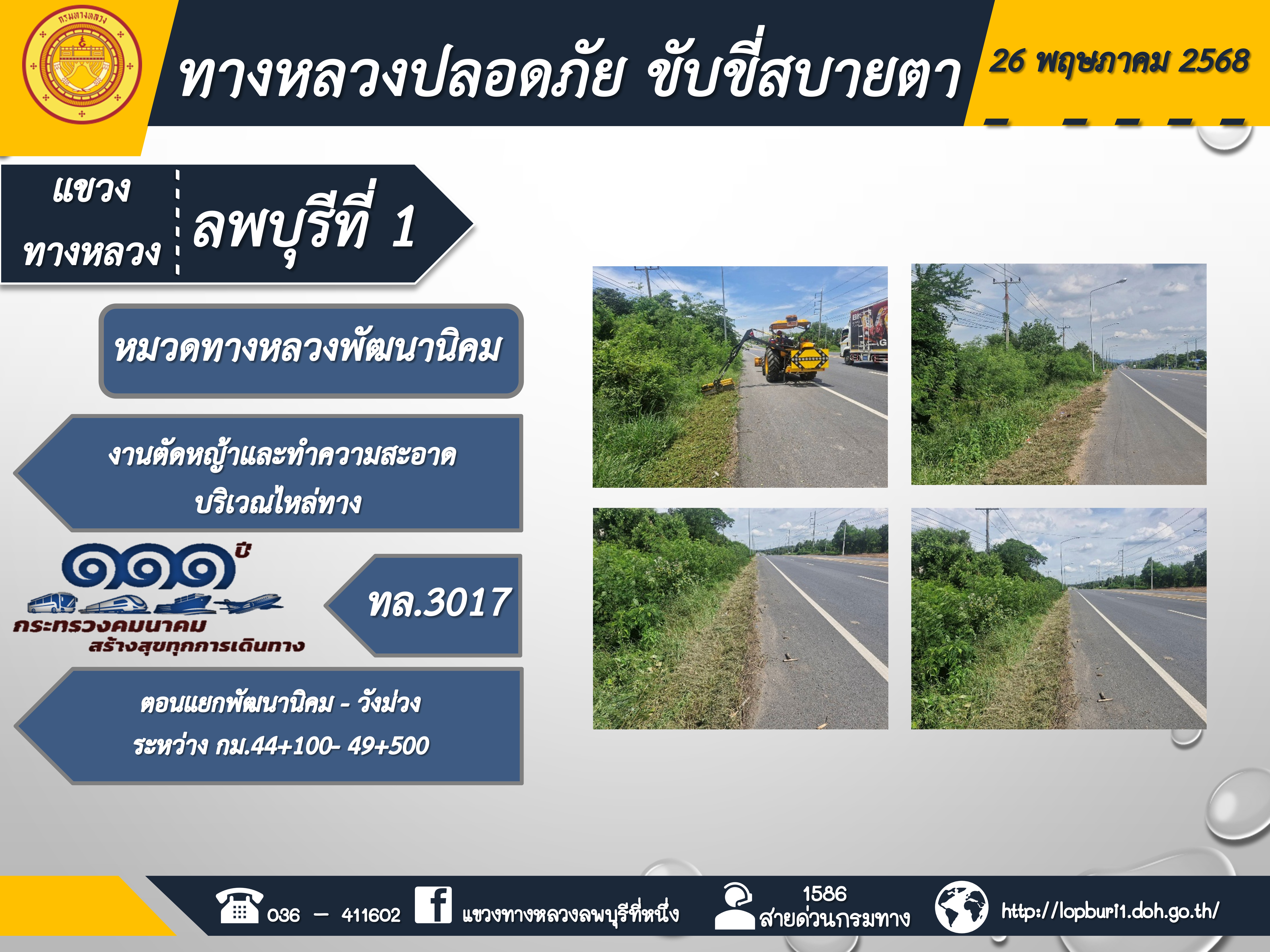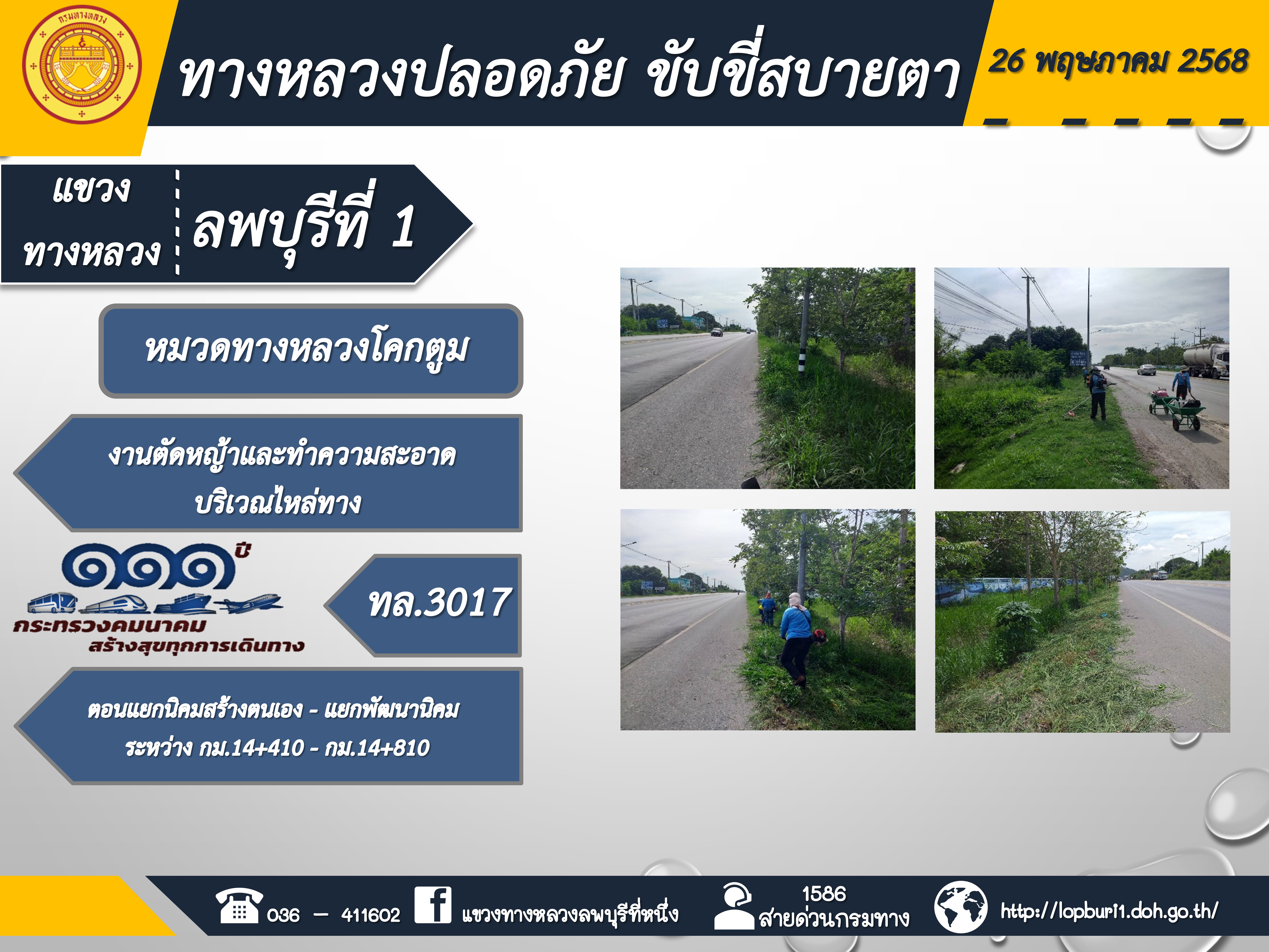 ทางหลวงปลอดภัยขับขี่สบายตา แขวงทางหลวงลพบุรีที่ 1 ประจำวันที่ 26 พฤษภาคม 2568