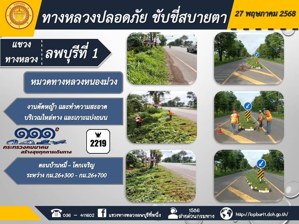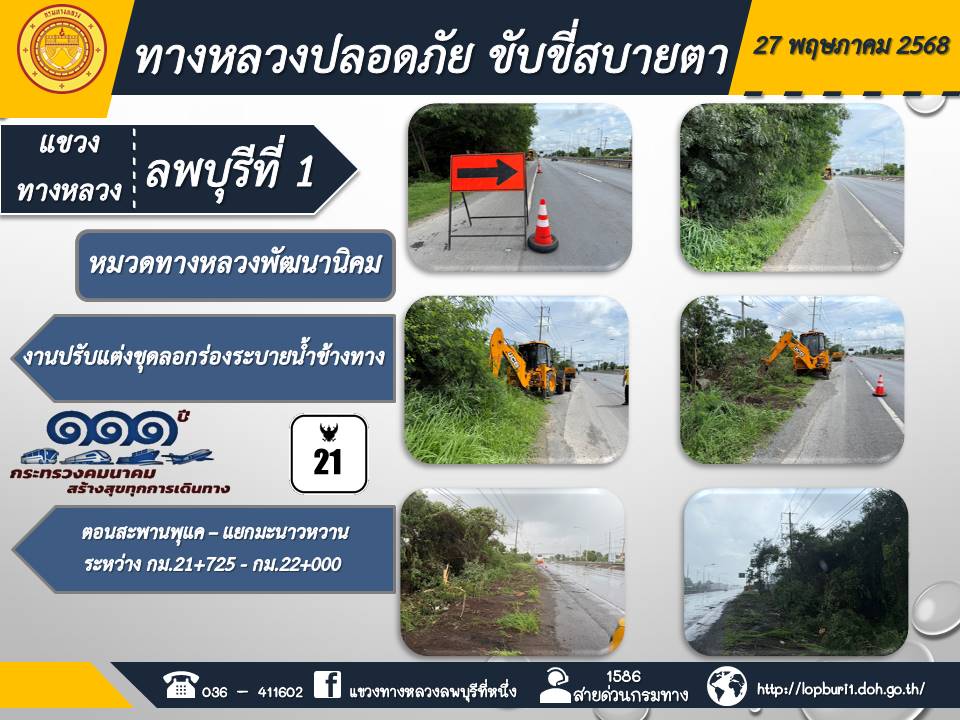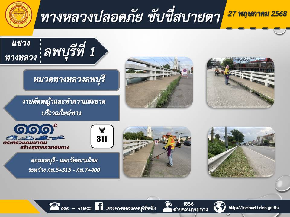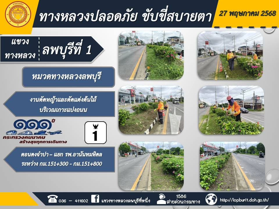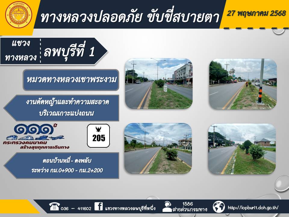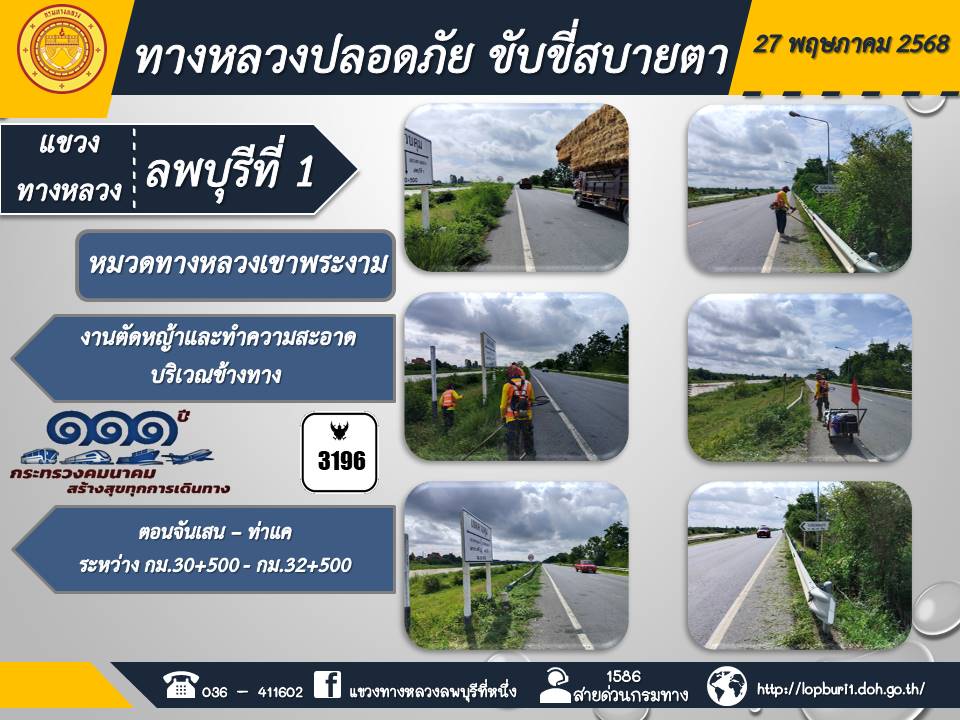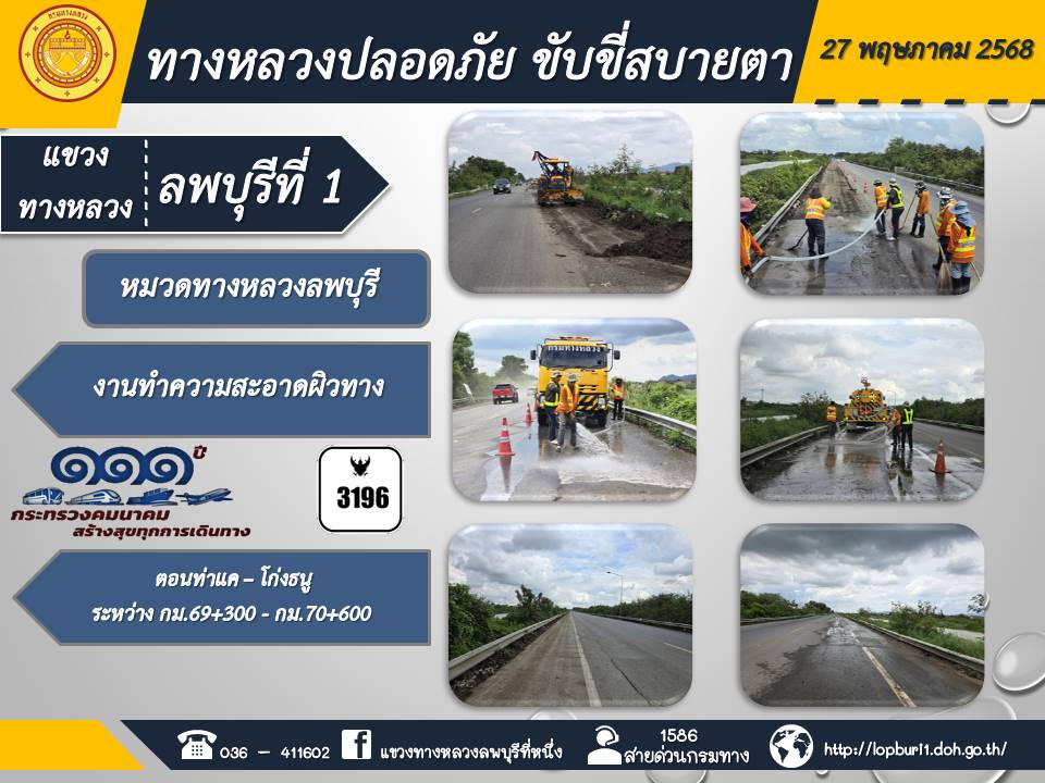 ทางหลวงปลอดภัยขับขี่สบายตา แขวงทางหลวงลพบุรีที่ 1 ประจำวันที่ 27 พฤษภาคม 2568
