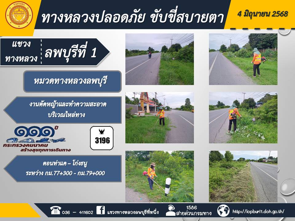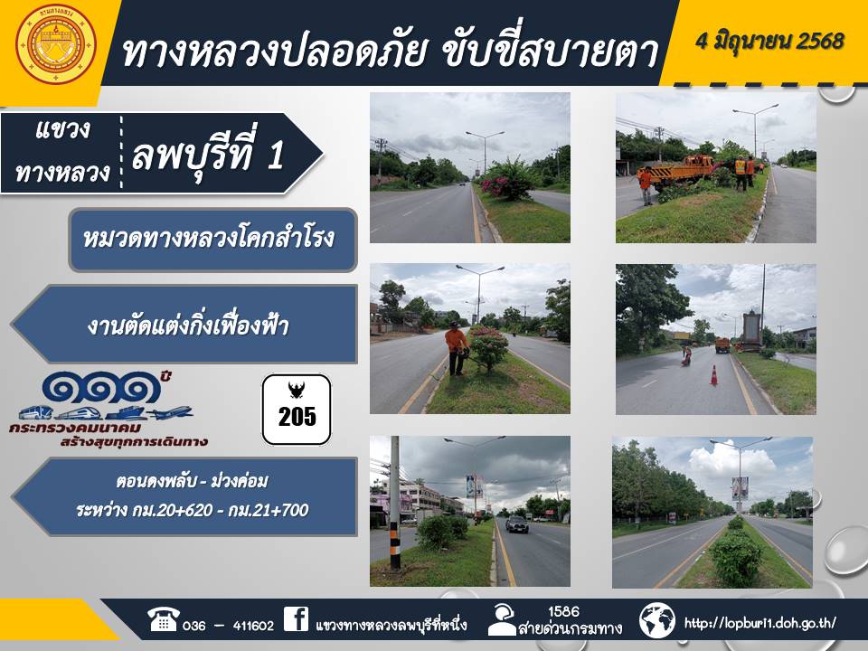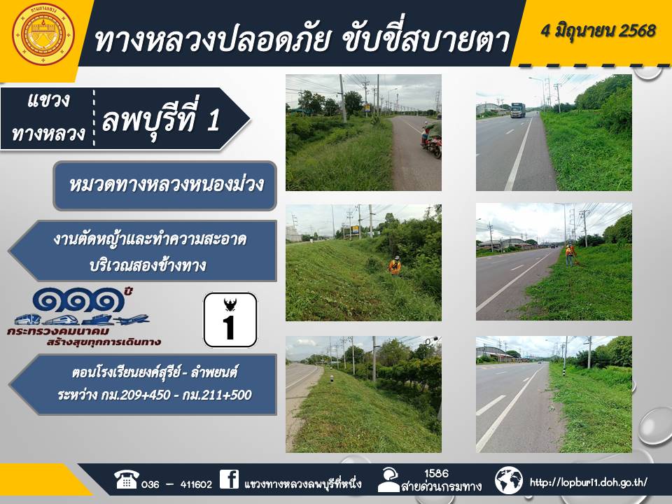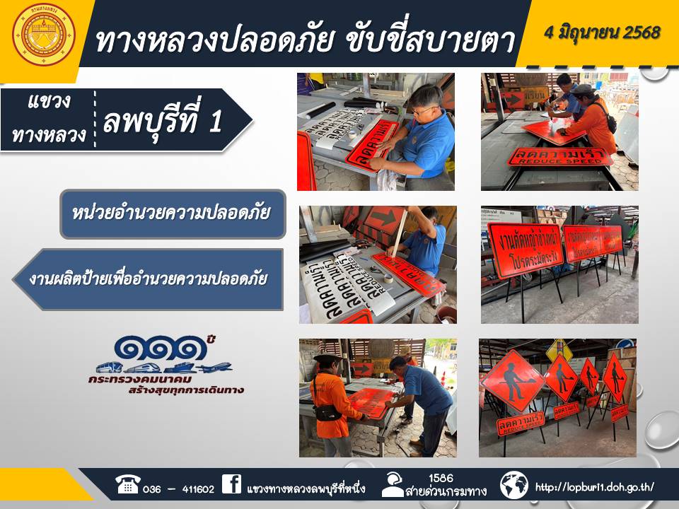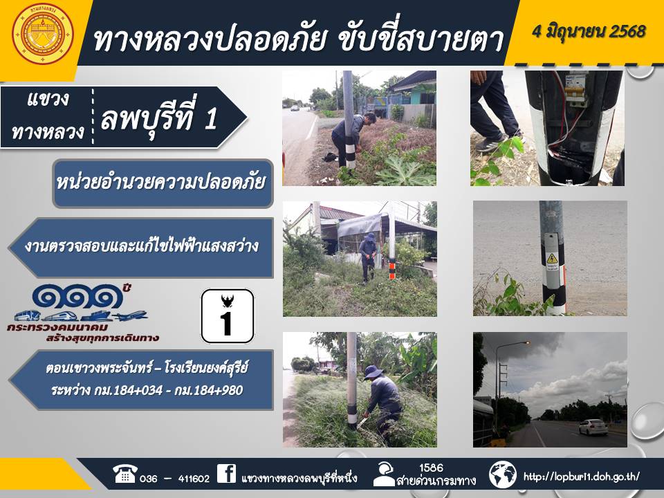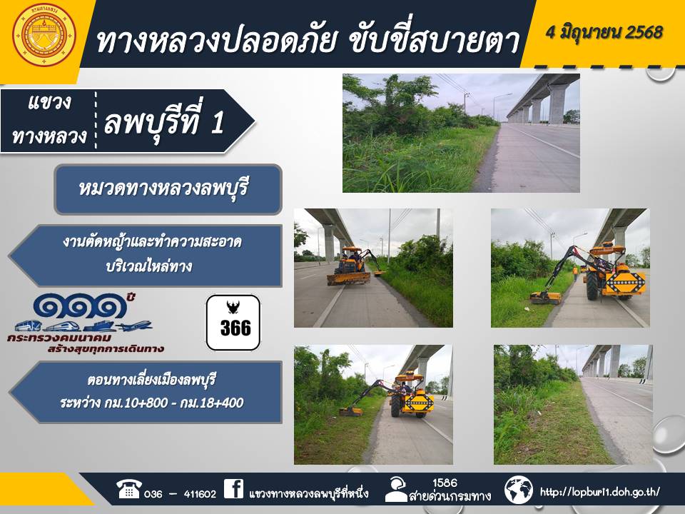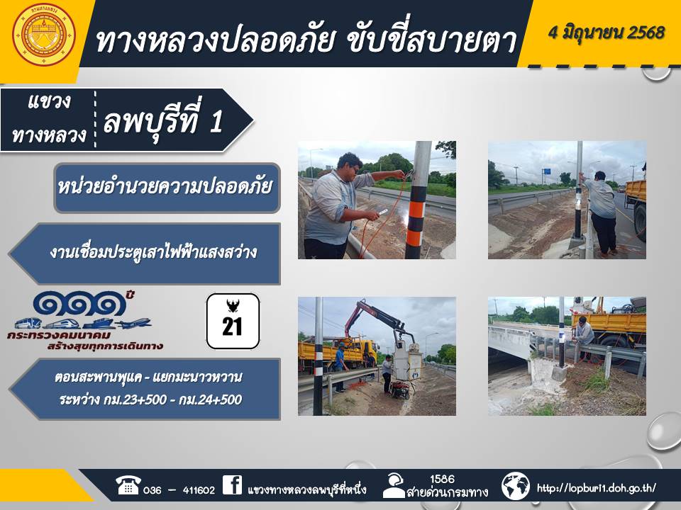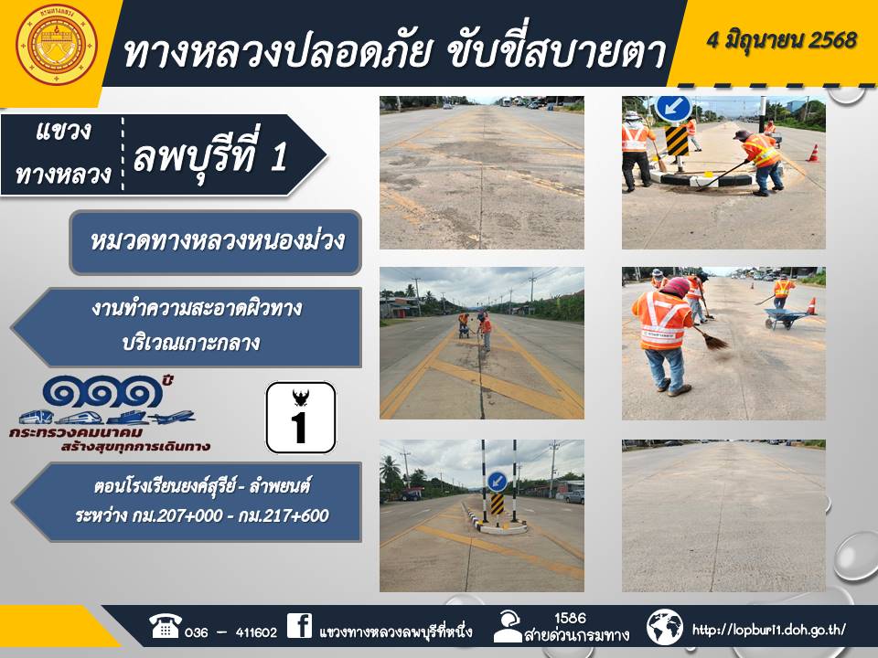 ทางหลวงปลอดภัยขับขี่สบายตา แขวงทางหลวงลพบุรีที่ 1 ประจำวันที่ 4 มิถุนายน 2568